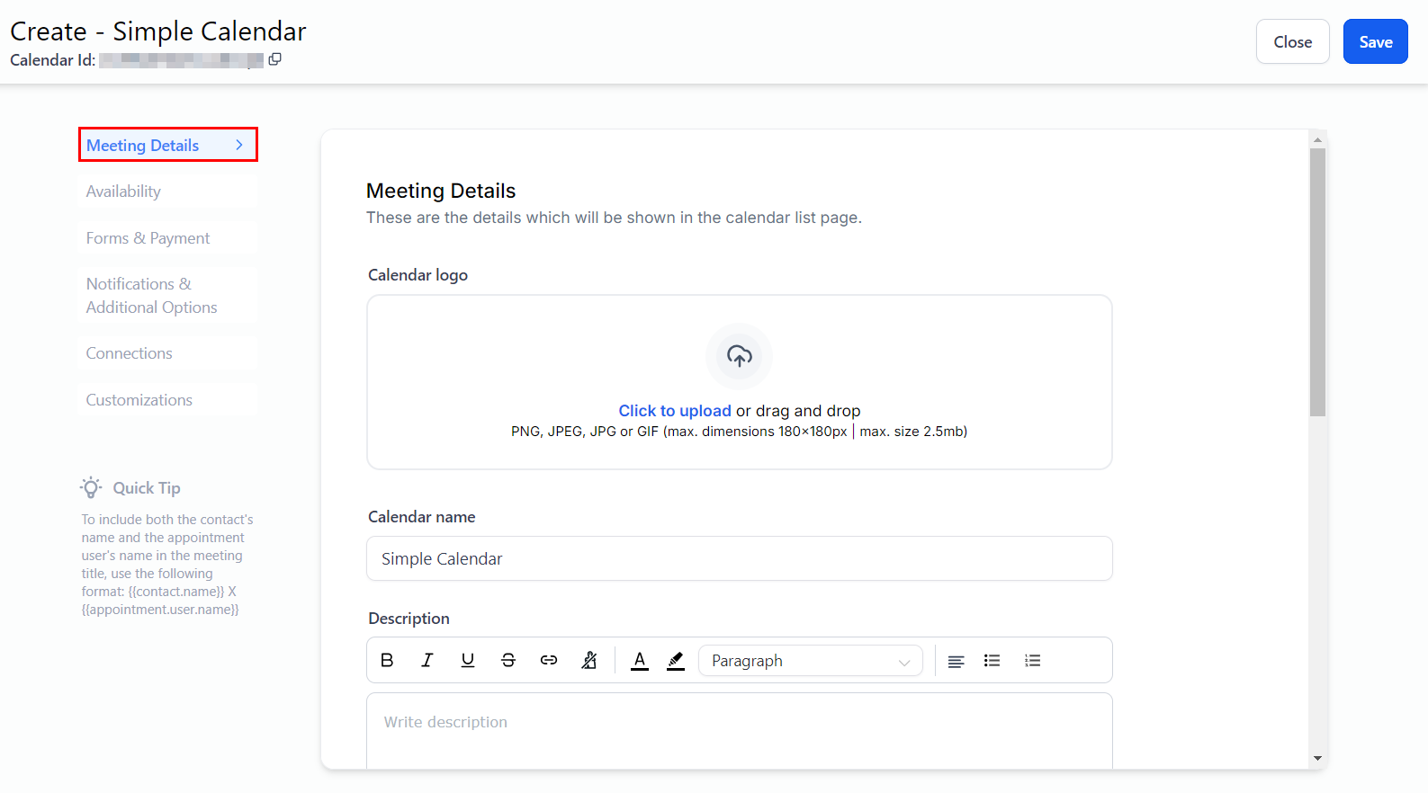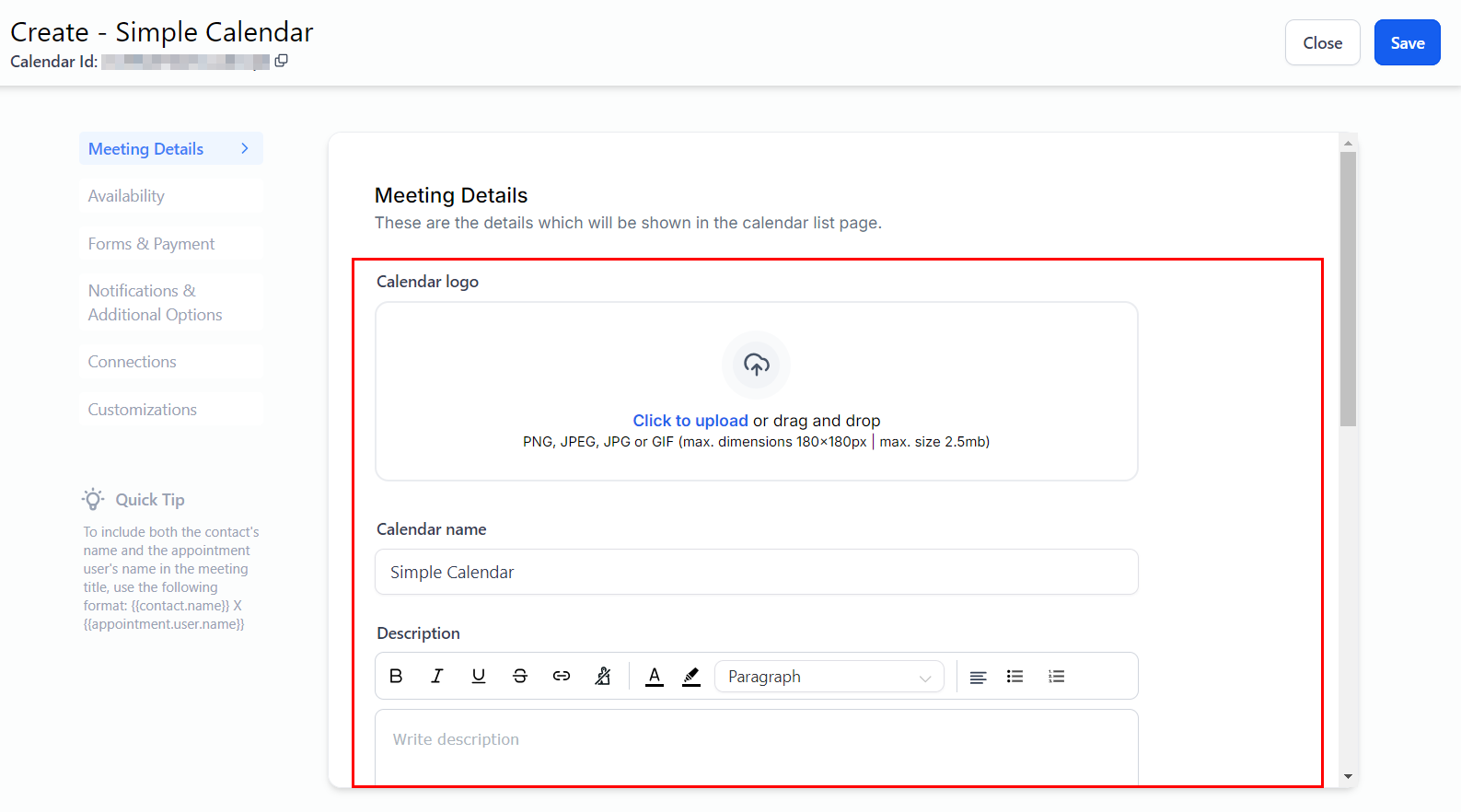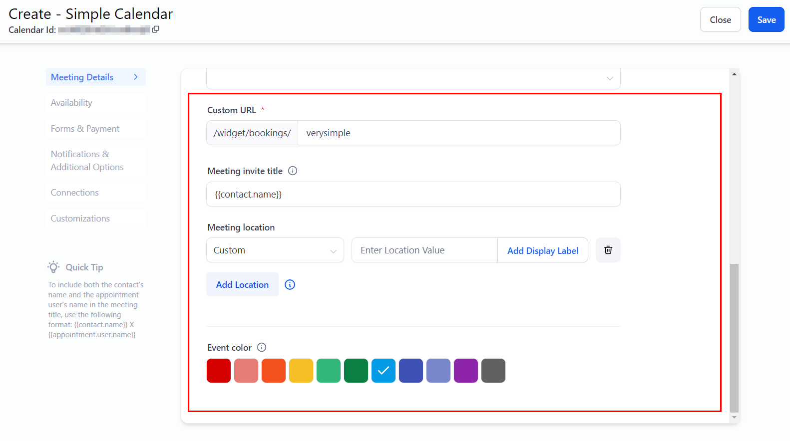 The Meeting Details section allows you to enhance the design and functionality of the Calendar List page by adding important details such as the name, description, and meeting location of your appointments.