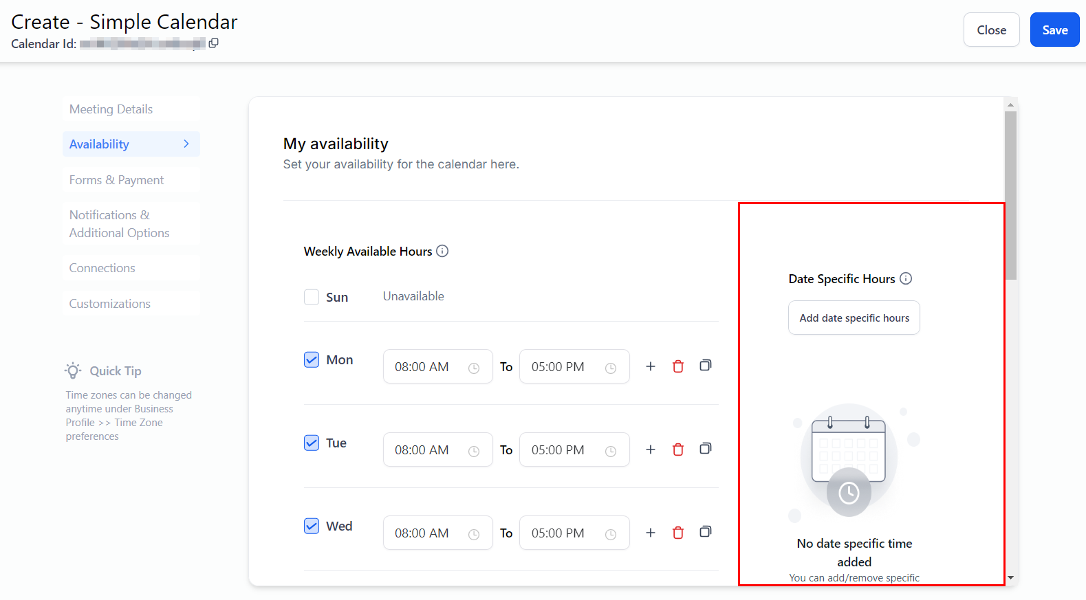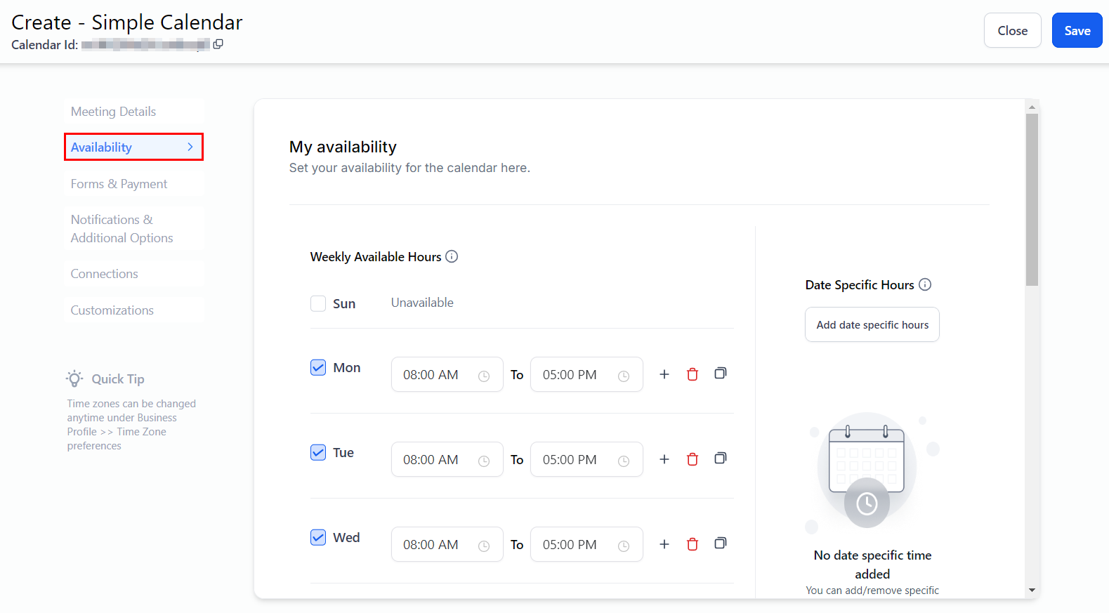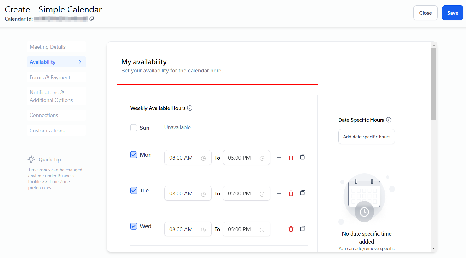 This section manages your calendar's time settings, including the general days and times available for appointments. Here, you can configure the schedule for recurring meetings and adjust settings for when appointment slots are open for booking.