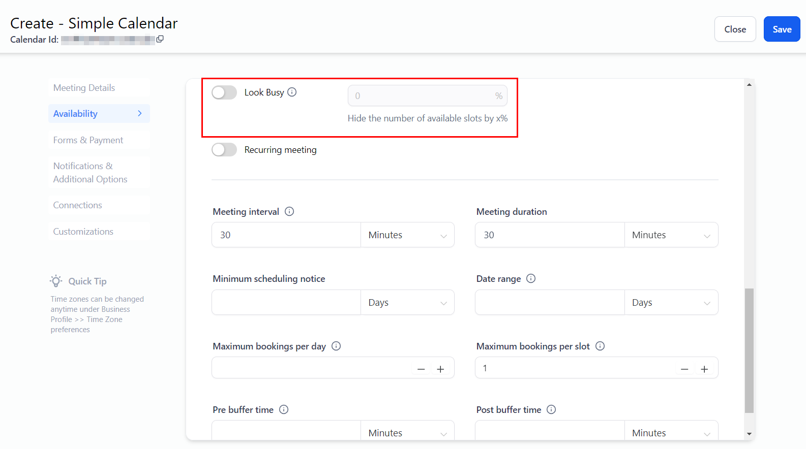 When you activate the "Look Busy" feature, you can define a percentage of time slots to conceal from your overall availability. This percentage is then randomly hidden from the scheduling widget. As new appointments are booked, the visible slots will appear unchanged until the actual number of available slots aligns with what is being shown. Once this occurs, the widget will display only the true remaining available slots.