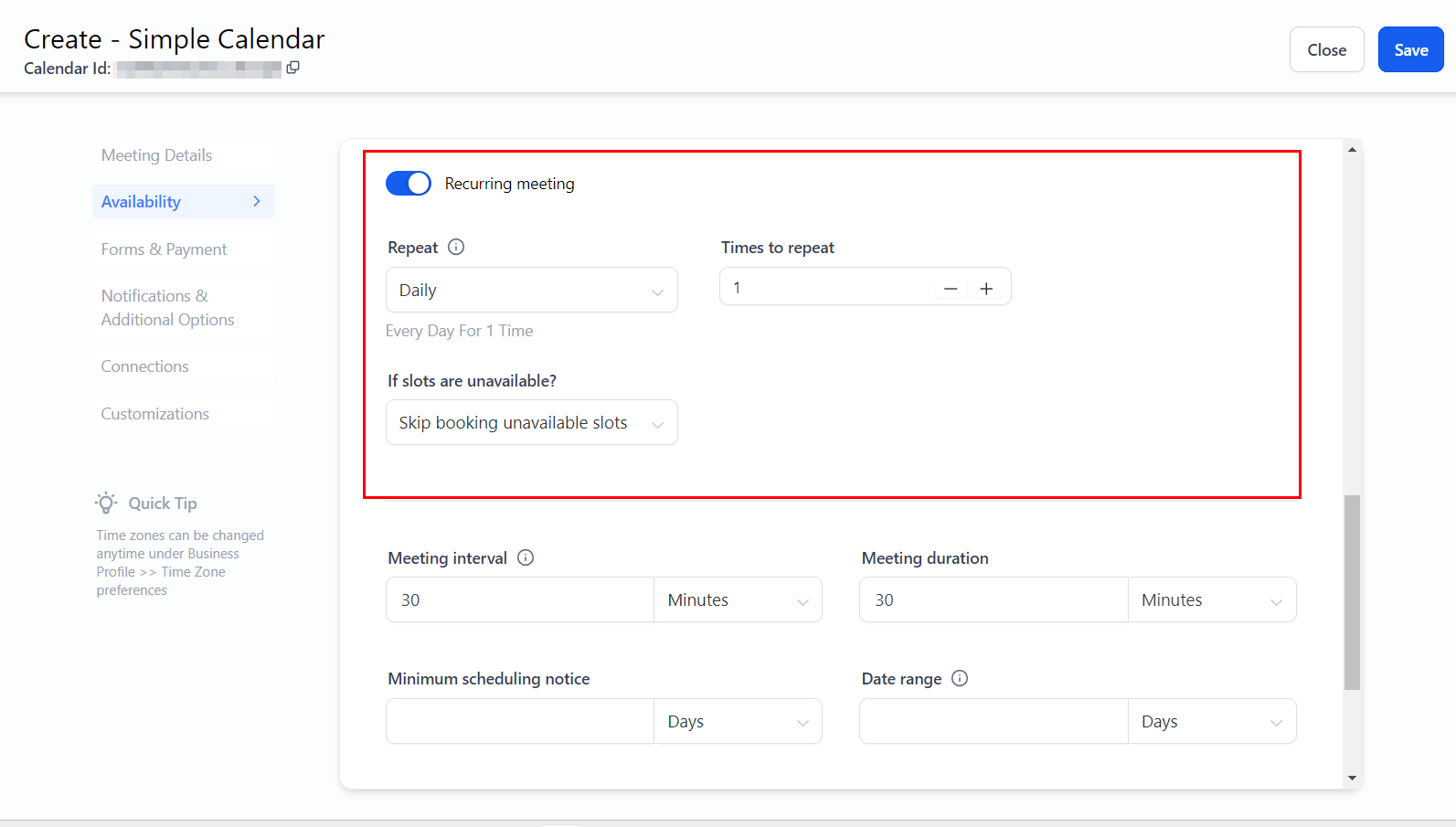 Enable this option for recurring meetings. Set the desired frequency for the appointment and the total number of consecutive occurrences. For unavailable time slots, you can choose to skip those slots, reschedule the appointment in the next available slot, or continue booking regardless of availability.