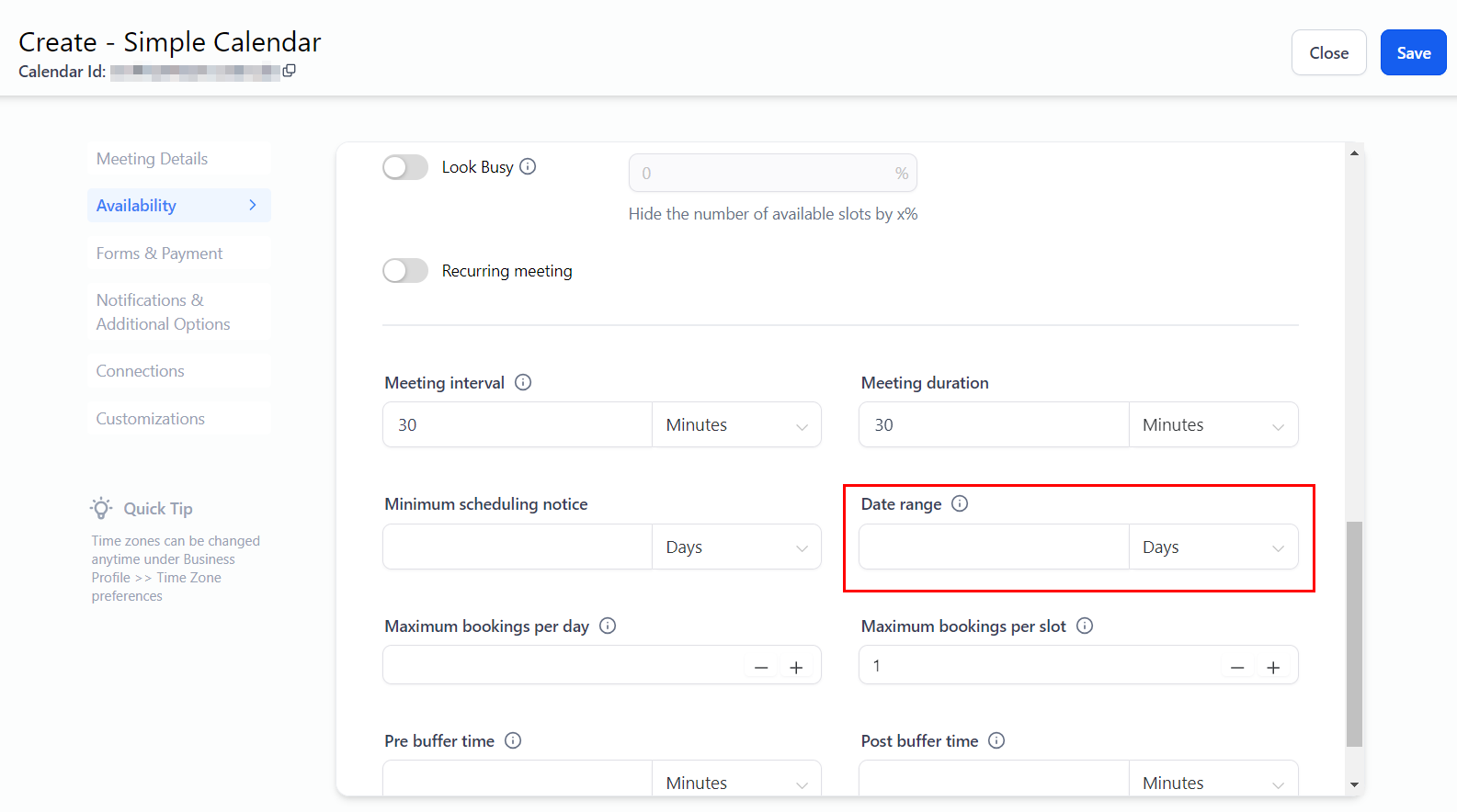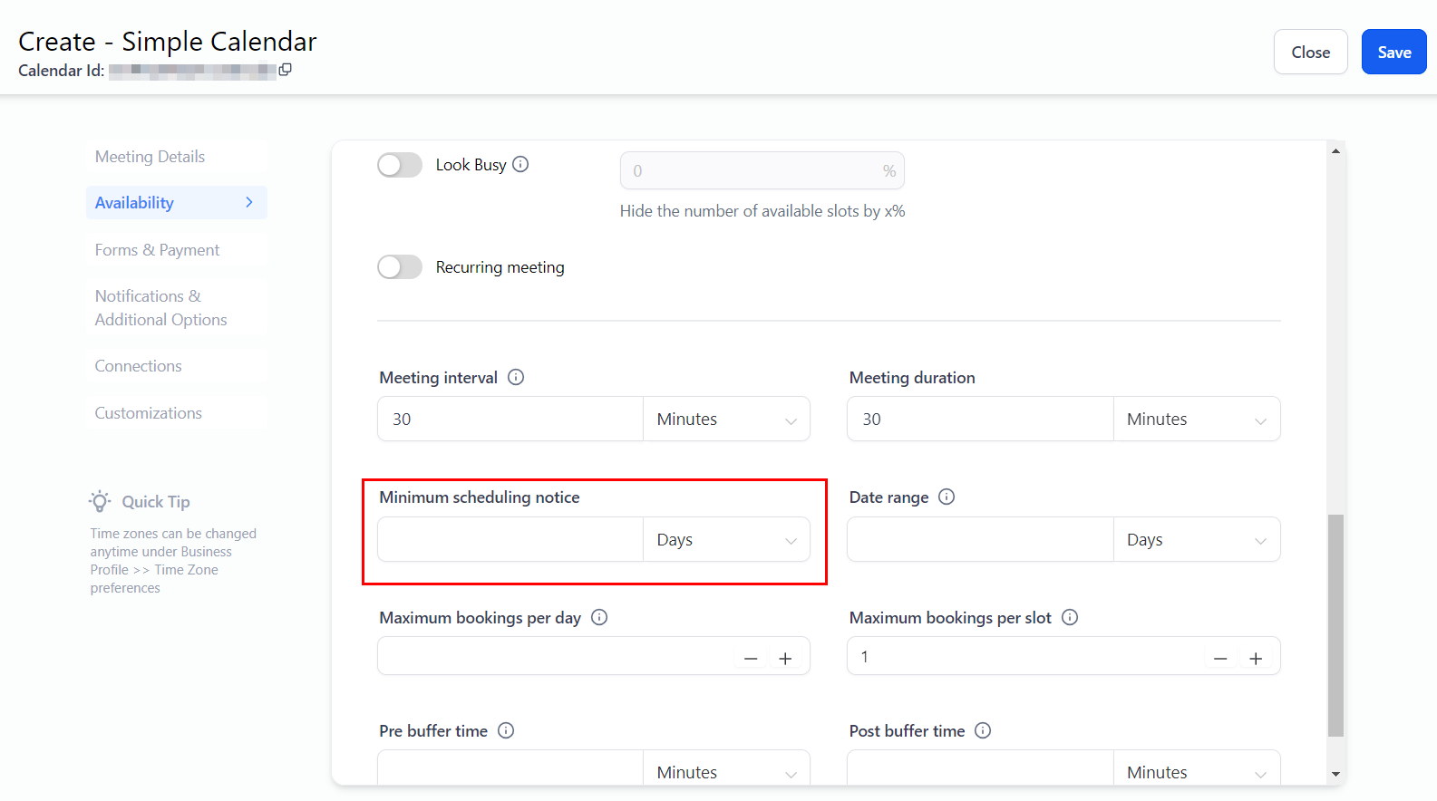 This setting determines the minimum lead time required for booking appointments in your calendar, helping you avoid unexpected meetings. For instance, if you select a 2-day lead time, no one will be able to book a time slot less than 48 hours in advance.