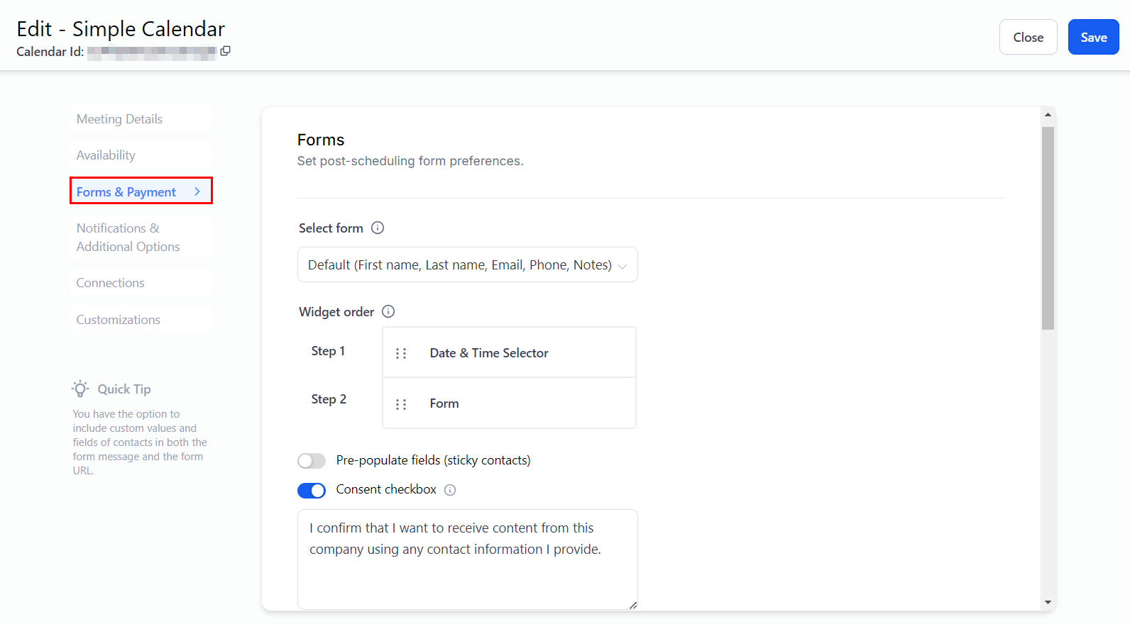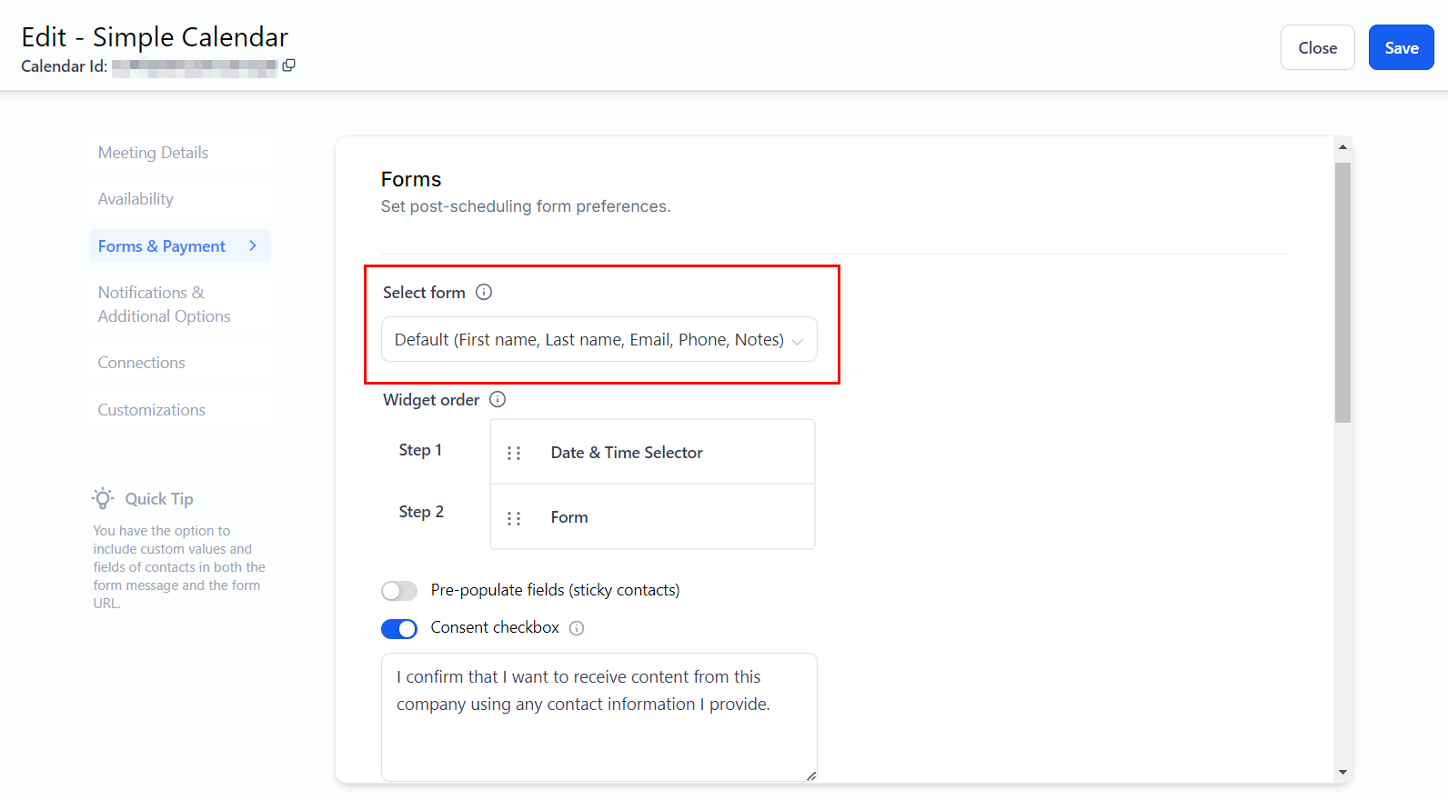 Here, you can choose the form this calendar uses to book the appointment from the dropdown menu.