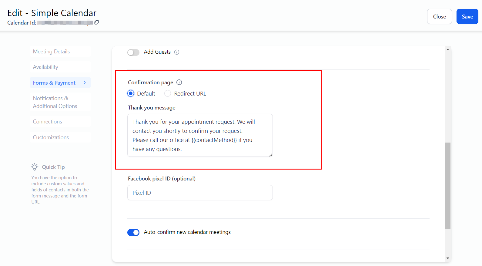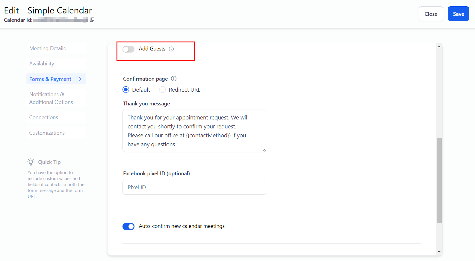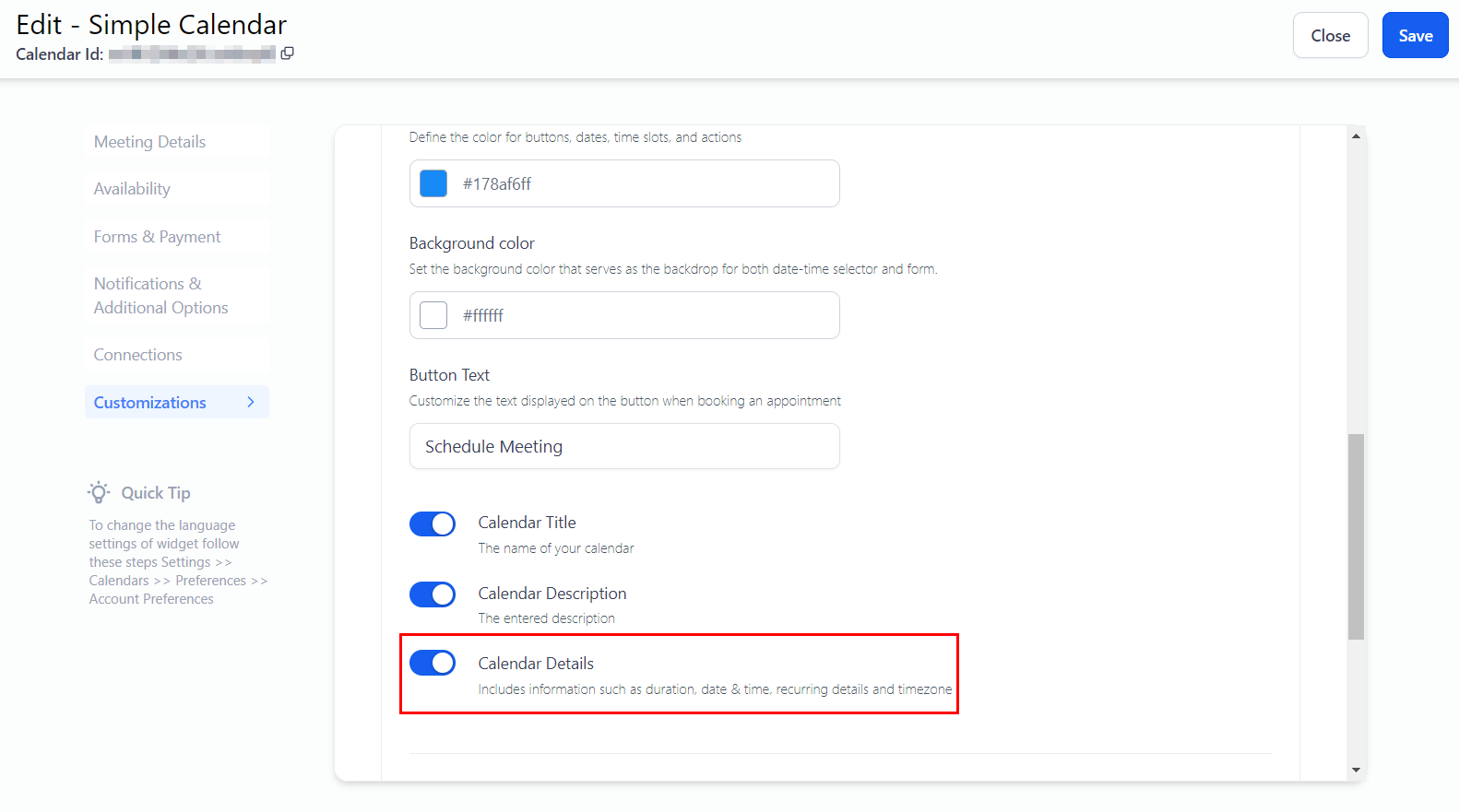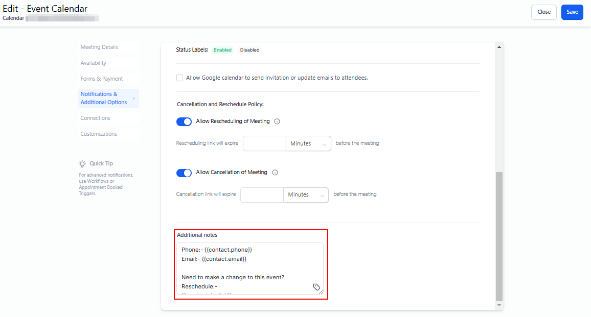 When enabled, calendar information such as the appointment's duration, date and time, recurring details, and time zone settings will be displayed.