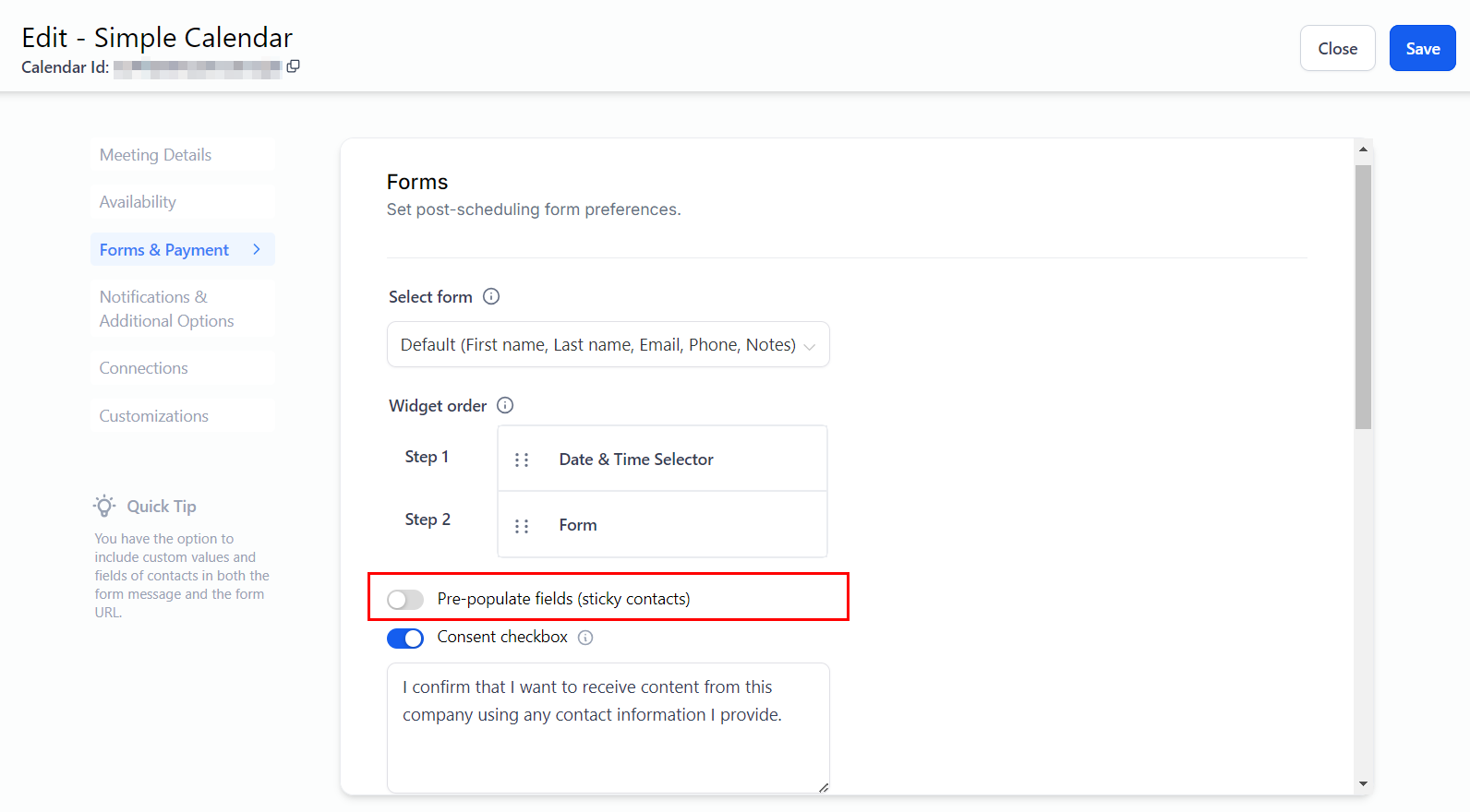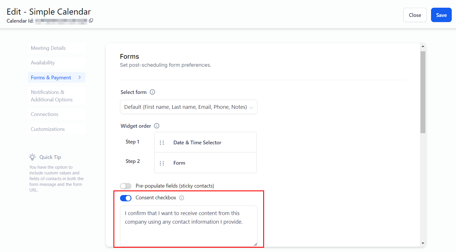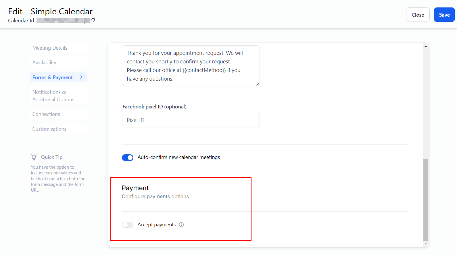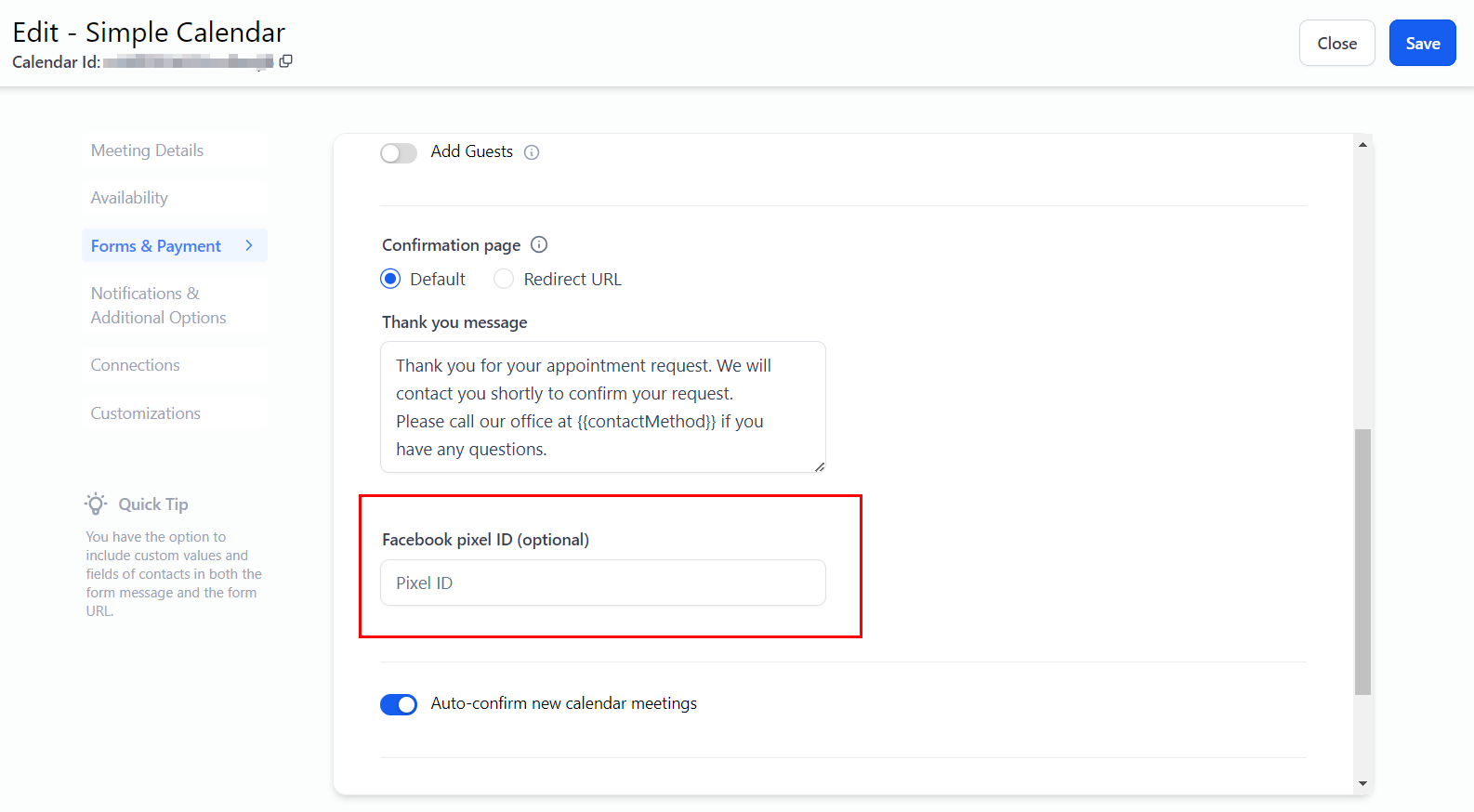 When enabled, calendar information such as the appointment's duration, date and time, recurring details, and time zone settings will be displayed.
