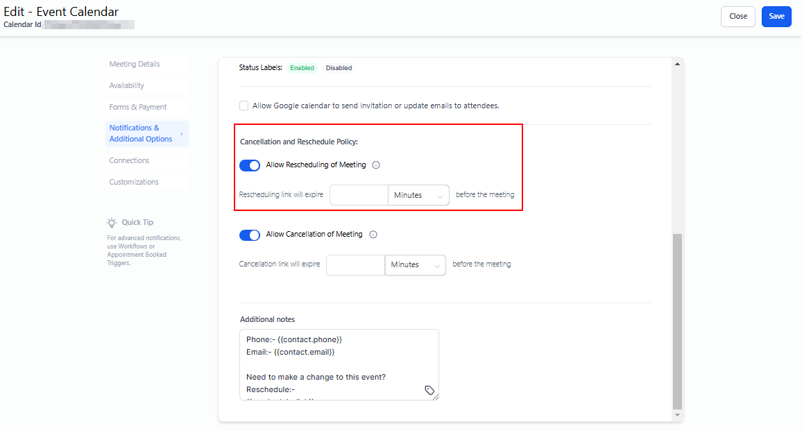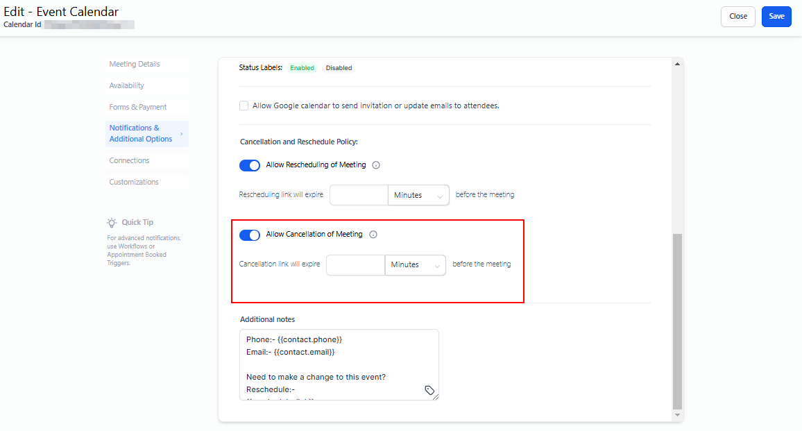 When enabled, a cancellation link will be added to both the additional notes section and the calendar invite. This link will expire based on the configured time before the meeting starts, preventing the booker from canceling the meeting after this period.
