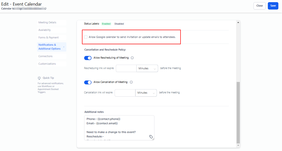 By enabling this option, an email notification will be sent whenever you make changes to the appointment if the appointment was scheduled on a Google Calendar.