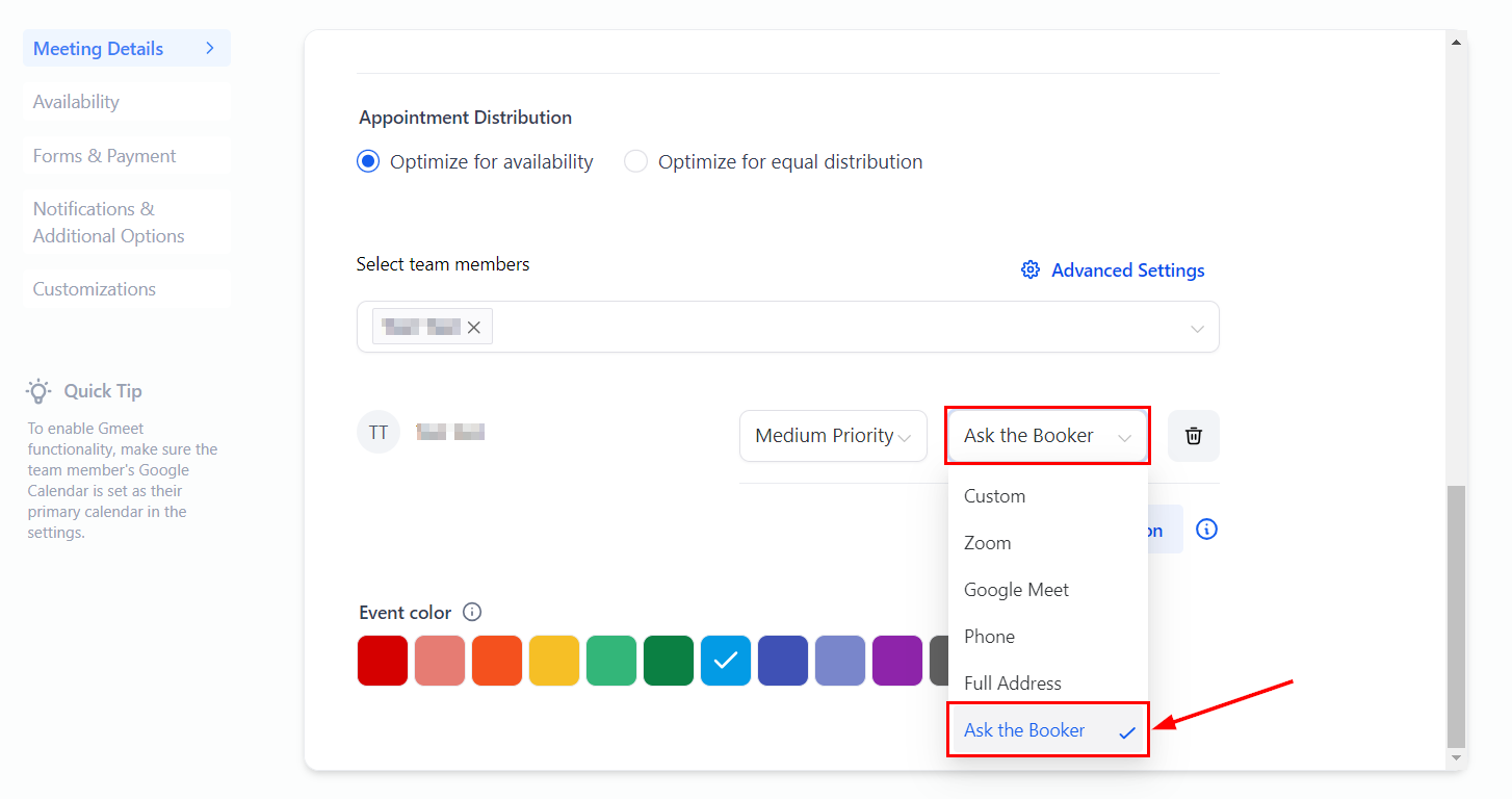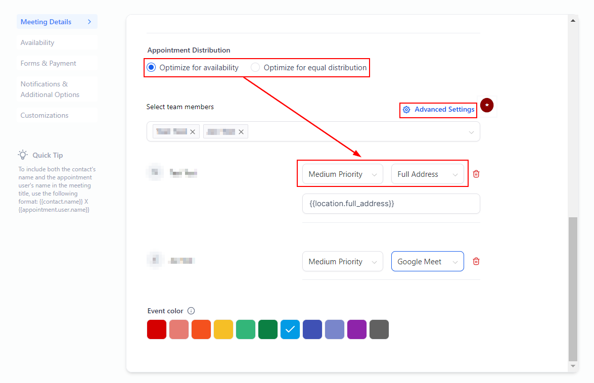 5. Appointment distribution: Define how appointments are assigned to the teammates, optimizing for availability will assign the appointment to whoever is free at the selected time, if two or more users are available it will assign it to the highest priority one or at random if they have the same priority level. Optimizing for equal distribution will assign the appointment to each user at random.