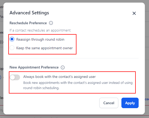 (*) Appointment distribution advanced settings: The advanced settings consist of rescheduling and new appointment preferences allowing you more control over which user gets the appointment. In Reschedule Preference you can leave the rescheduled appointment user random or keep it under the same one every time. With New Appointment Preference you can auto-assign the appointment to the contact's assigned user keeping the experience consistent.