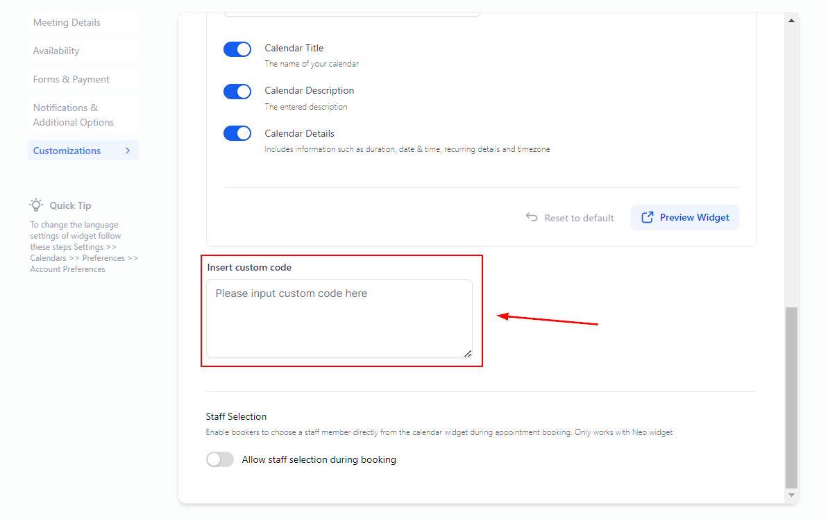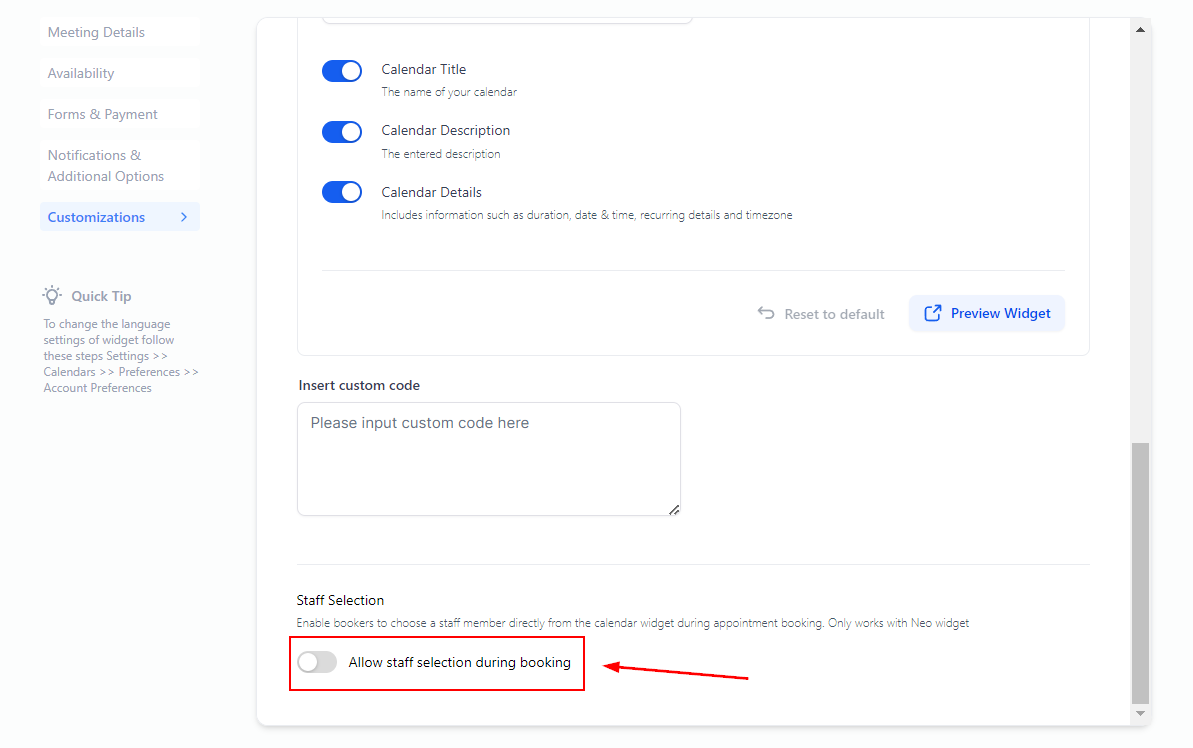 πNOTE: Turn off βAllow Staff Selectionβ to prevent bookers from changing the staff member on the booking widget.