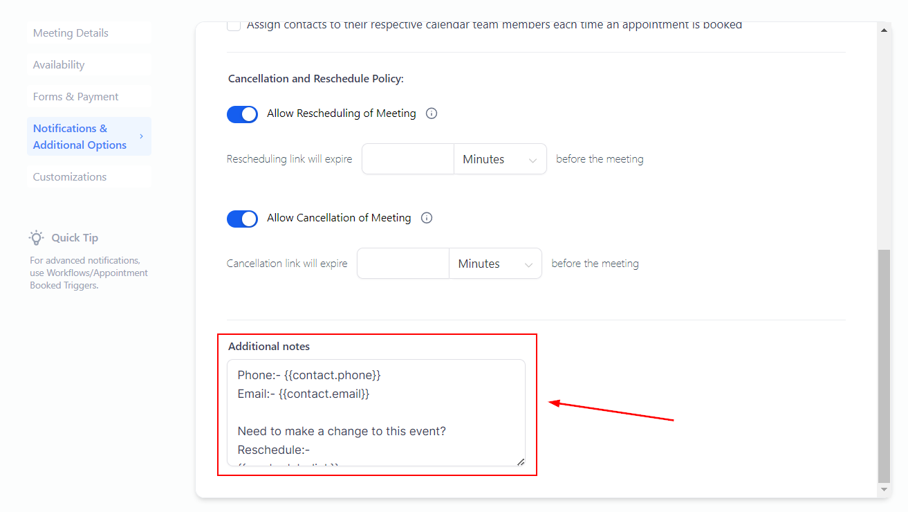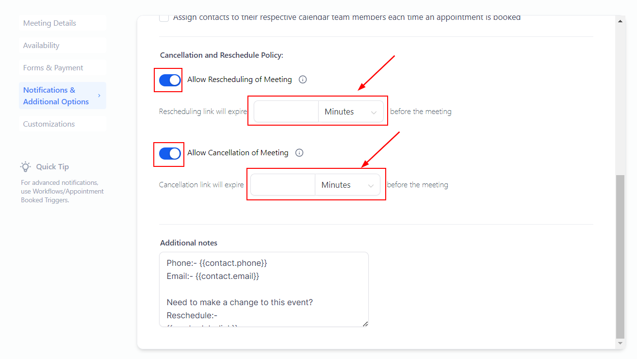 Cancellation and Reschedule Policy: If the option is toggled on the system automatically adds a link for the contacts to handle the rescheduling or cancelation, this link can be removed by toggling the button off. Additionally, you can give this link an expiration window limiting how soon it can be used before the appointment.