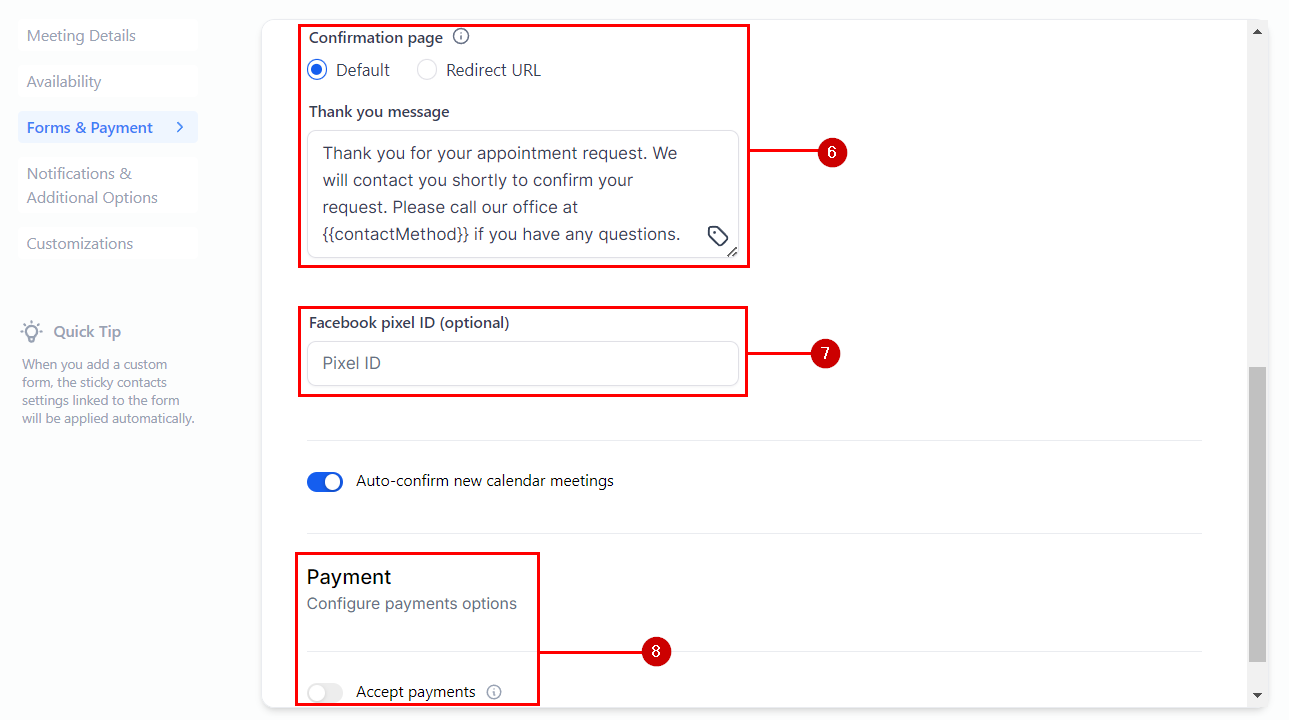 Confirmation page: This will show after someone makes a booking, if you use Default you can set a custom message on the same page, or by selecting Redirect URL you can send the contact to a website of your choice.