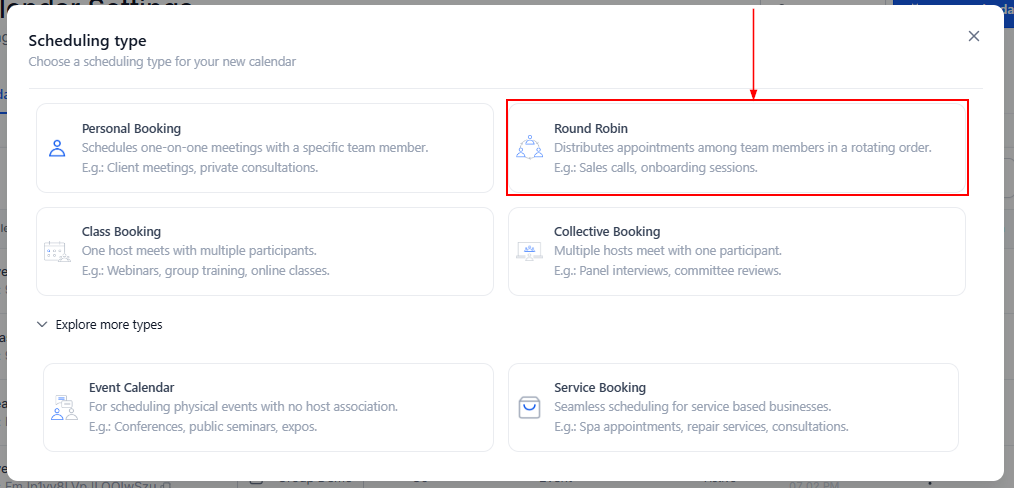 When creating a calendar you have a few types to choose from, one of them will be the Round Robin. This kind of calendar allows you to add as many team members as needed and rotate between them, based on priority or availability, ensuring all team members that take these appointments get booked and available hours don't go unnoticed.