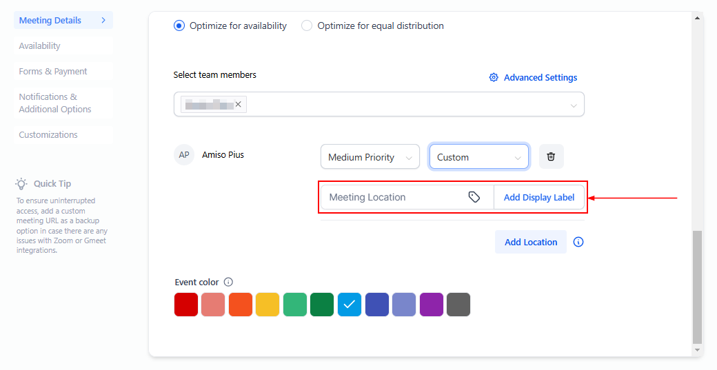 For custom locations, you have the option to add a display label for custom meeting locations within the multiple meeting location features. This allows you to input a placeholder name, such as "New York Office," which will be shown on the booking widget until the booking is confirmed. Once the booking is completed, the actual meeting location will be disclosed to the booker.