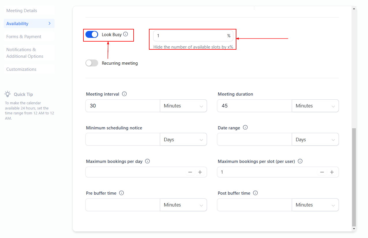 The "Look Busy" toggle, when enabled, hides a specified percentage of available time slots (set by the percentage field) to make the calendar appear busier and create a sense of urgency for clients when booking.