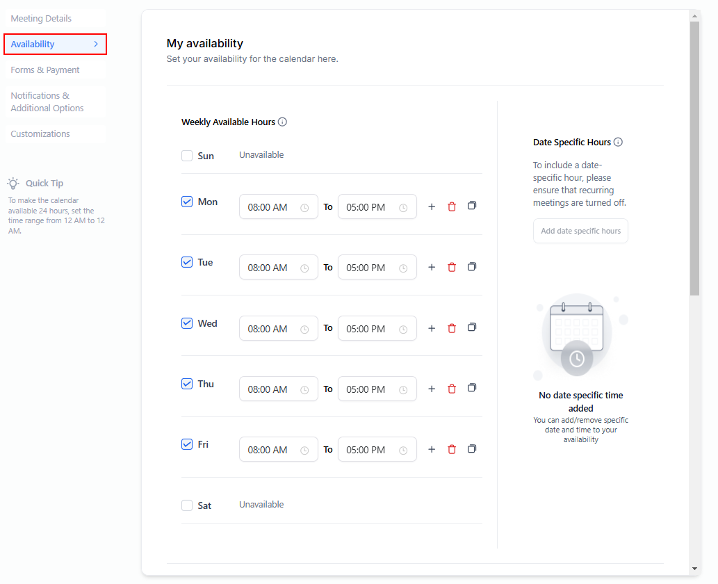 Meeting Interval: This will be the frequency for available time slots. For example, if you have a 30-minute slot interval, then your time slots will show availability every 30 minutes (10:00 am, 10:30 am, 11:00 am, etc.)
