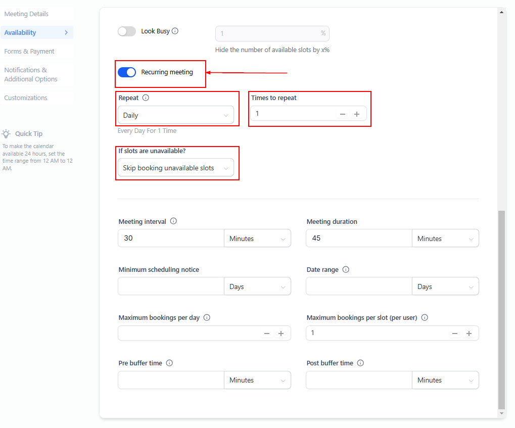 Toggle this option for meetings that happen more than once. Set the frequency at which this appointment should happen, Times to repeat will be the total amount of this appointment that will be scheduled consecutively. For unavailable slots, you can skip booking unavailable slots, book the appointment in the next available slot, or continue booking.