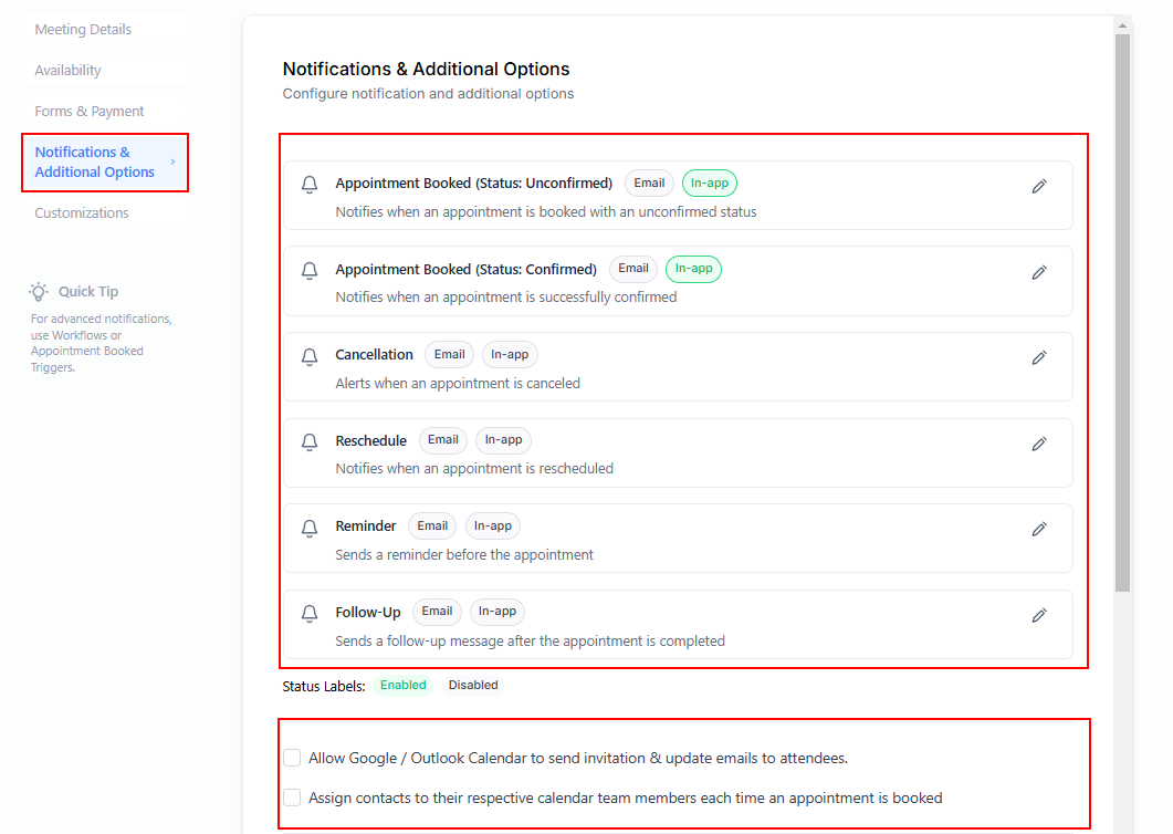 Additional options: By enabling option one an email will be sent out if you make any changes to the appointment directly inside the Google/Outlook calendar. By enabling the second option when an appointment is booked the team member will be selected as the contact's assigned user from that point onwards.