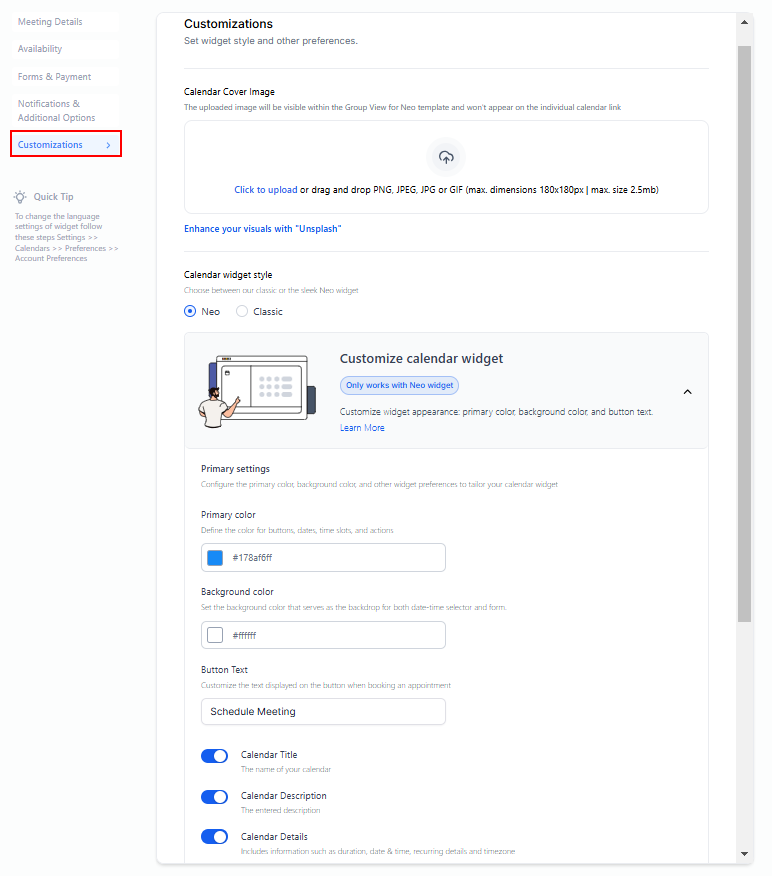 Personalize your calendar to the max here, you can add a cover image, change the style and colors of the calendar, the text of the button, and the information shown on the calendar.