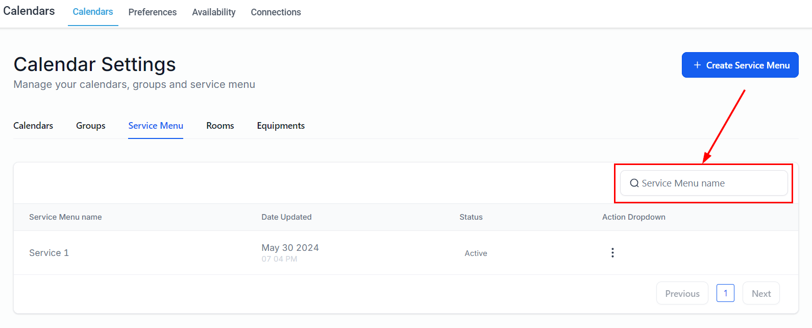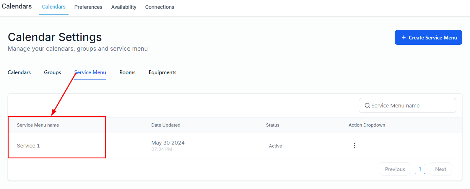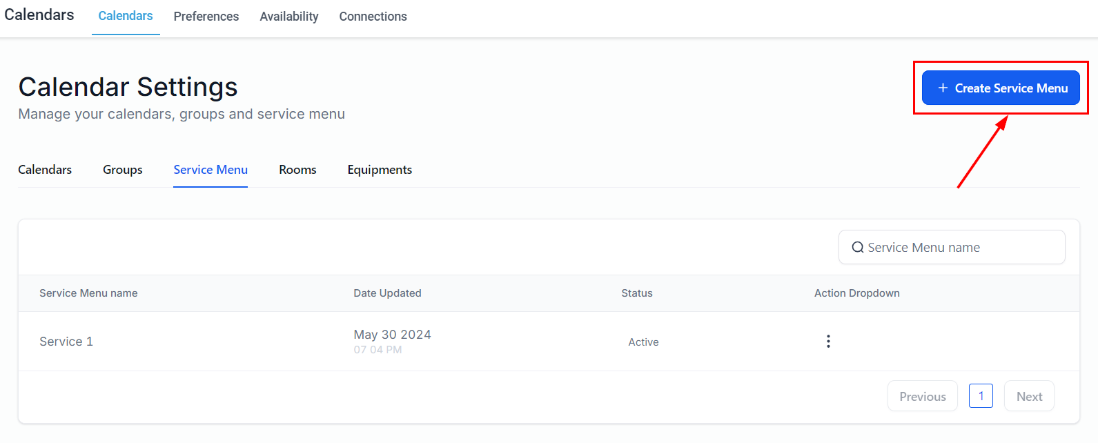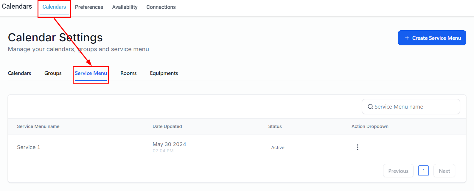 Add a new service menu by selecting the button on the upper right-hand corner of the page. Before proceeding, ensure that you have already created calendar groups and service calendars.
