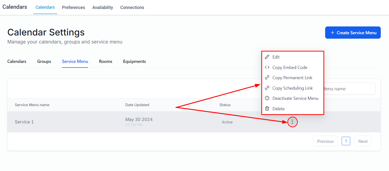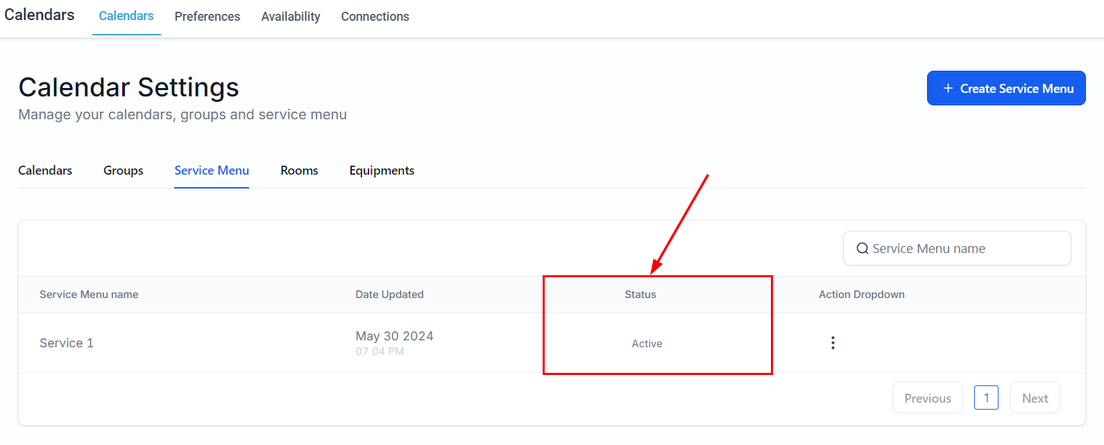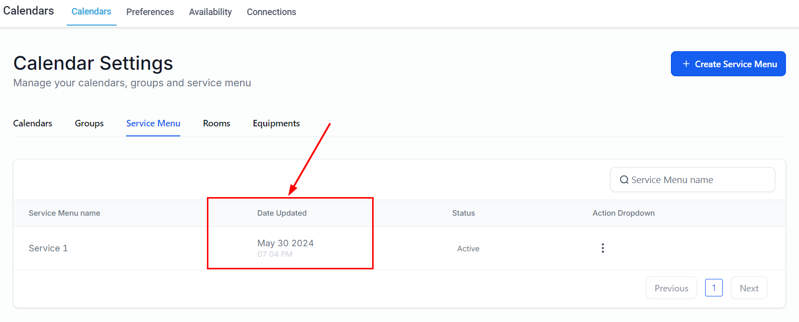 Add a new service menu by selecting the button on the upper right-hand corner of the page. Before proceeding, ensure that you have already created calendar groups and service calendars.
