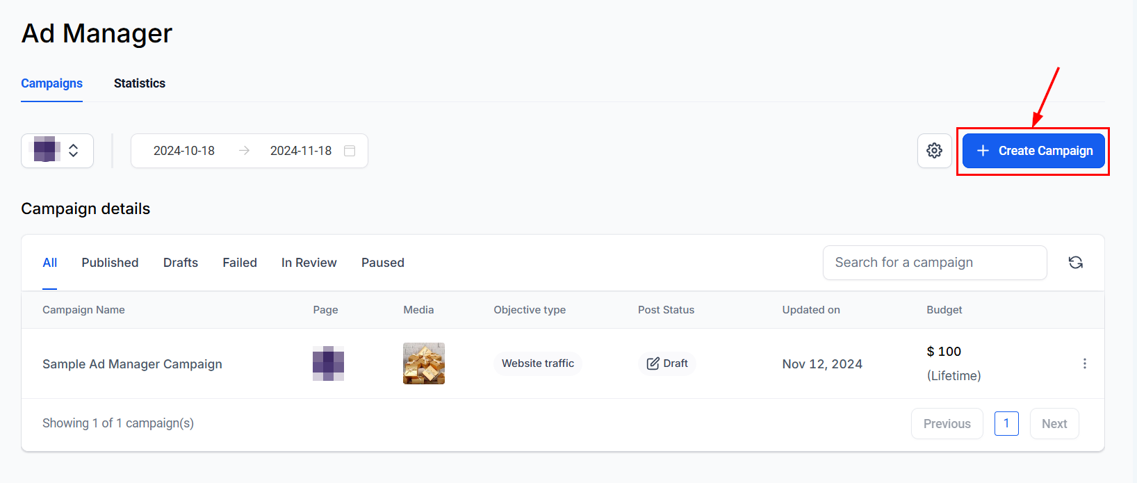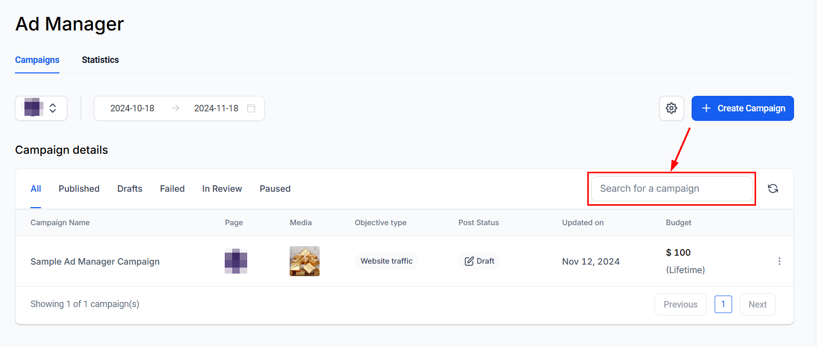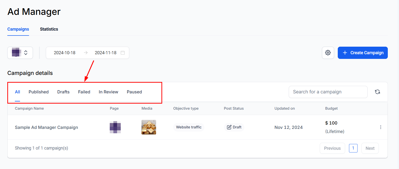 In this section, you can view the tabulated details of all your campaigns. Additionally, you can filter campaigns by status by selecting options such as Published, Drafts, Failed, In Review, or Paused.