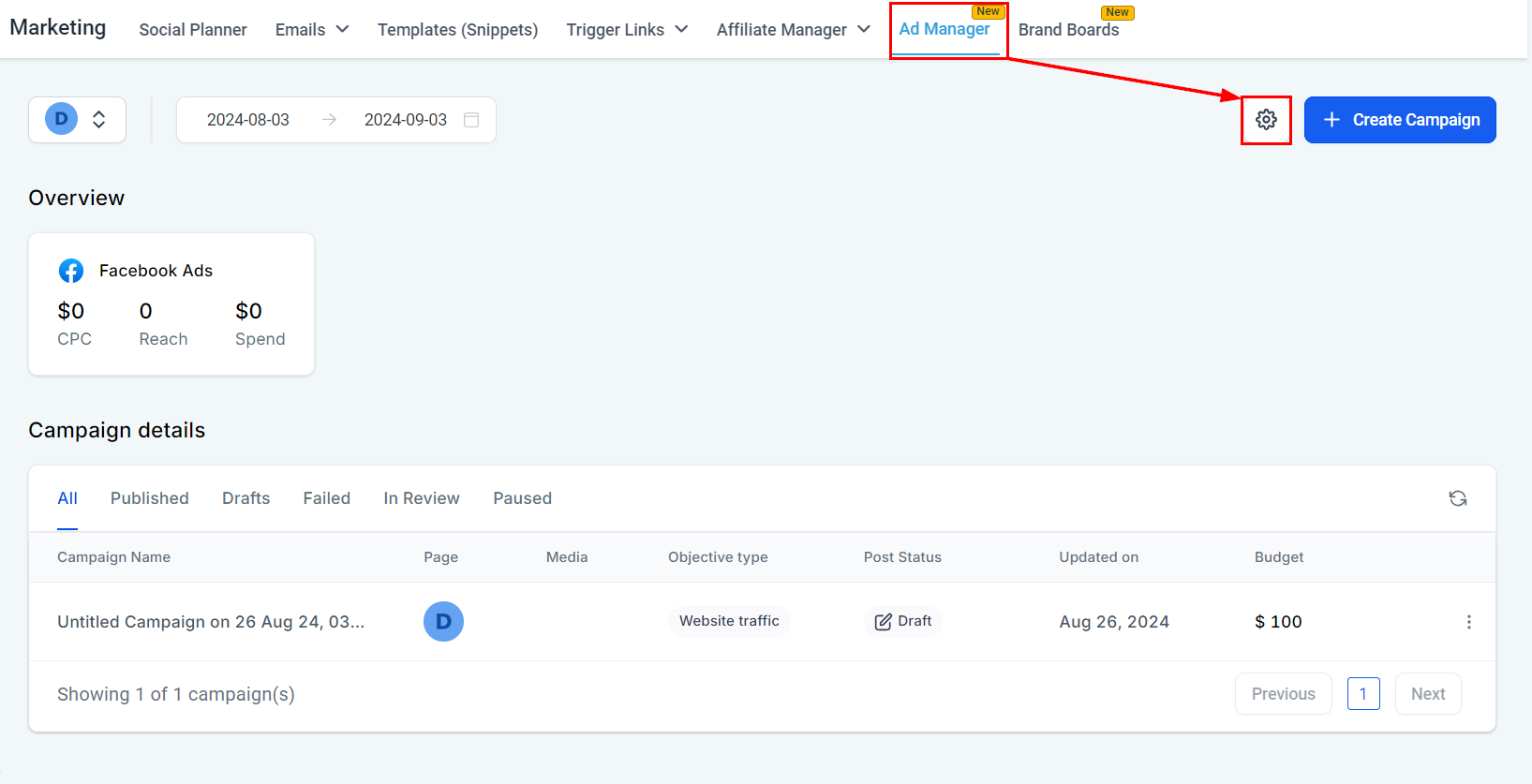 πNote: If a delinked Facebook page is reconnected to Ad Manager, all previously created campaigns on that page will be visible again in the campaign details section.