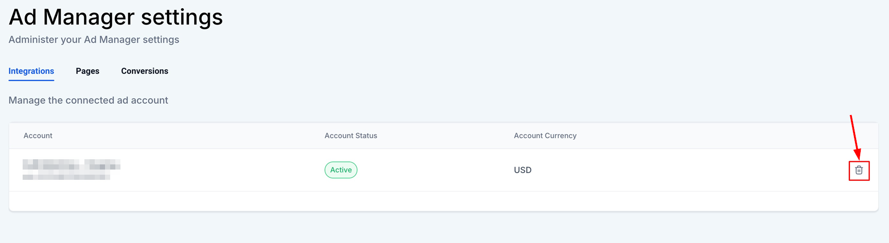 Users have the option to remove the connected ad account by clicking the delete button. If a user chooses to delete the account, a confirmation prompt will appear, and all campaigns in Ad Manager will no longer be visible.