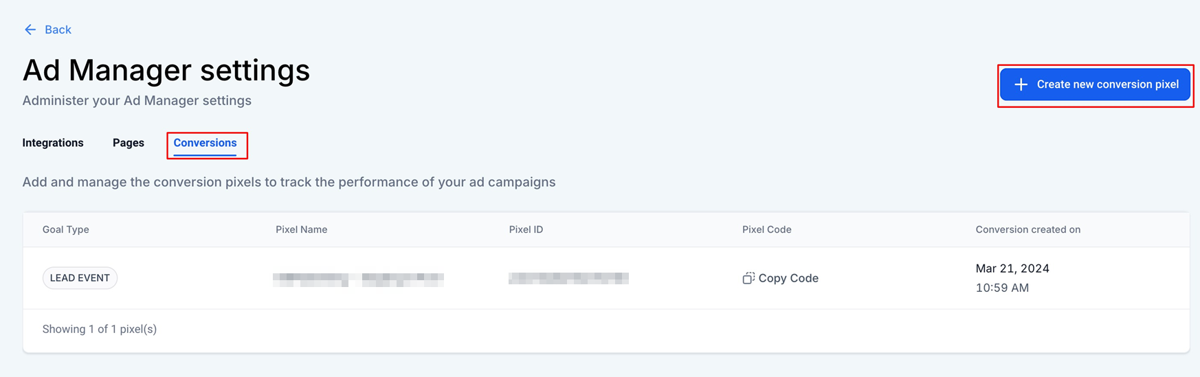 The Conversions tab lists all the pixels imported from the connected Meta Ad account, along with those created in Ad Manager using the "Create new conversion pixel" button.