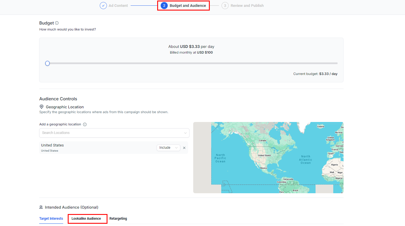 You can create Lookalike Audiences during the second step of the campaign creation process, labeled 'Budget and Audience,' you will find the Intended Audience section under Audience Controls.