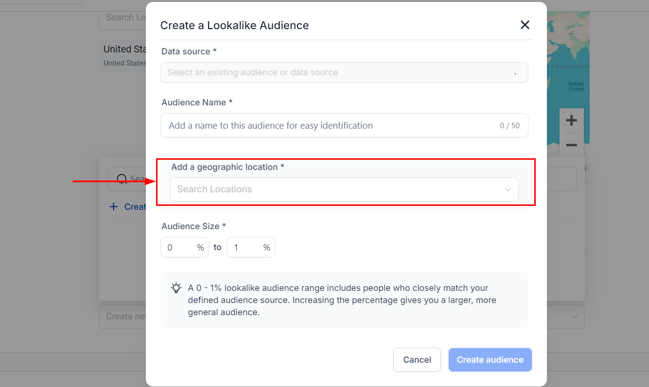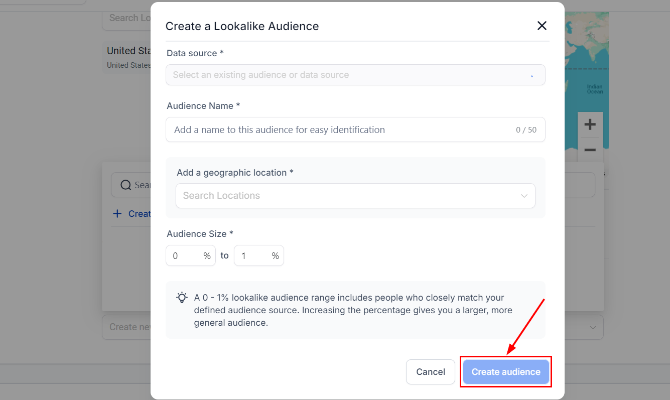 After entering all the necessary details, click "Create Audience." The newly created Lookalike Audience will appear in the dropdown but may not be ready for immediate use.