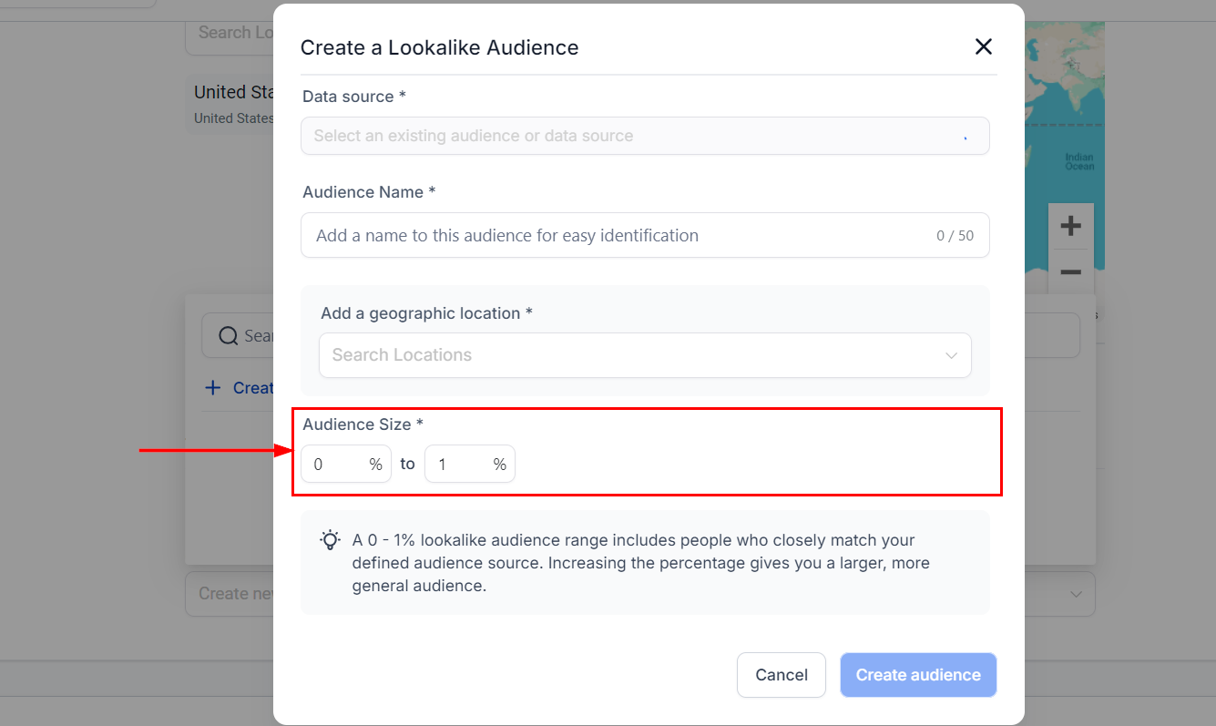 Define the audience size within a range of 0-10%. A 0-1% range includes individuals who closely match your source audience while increasing the percentage broadens the audience.