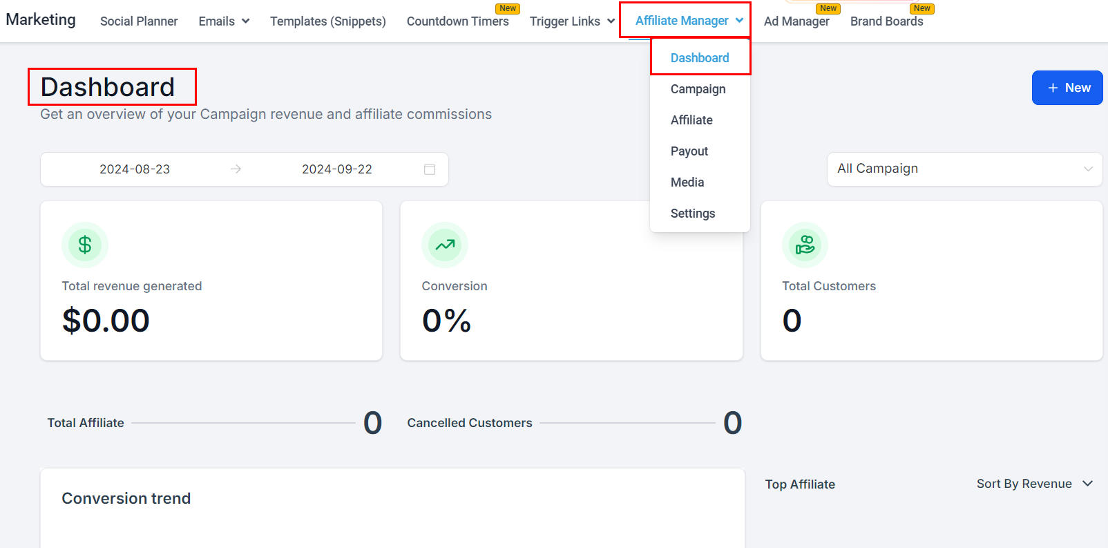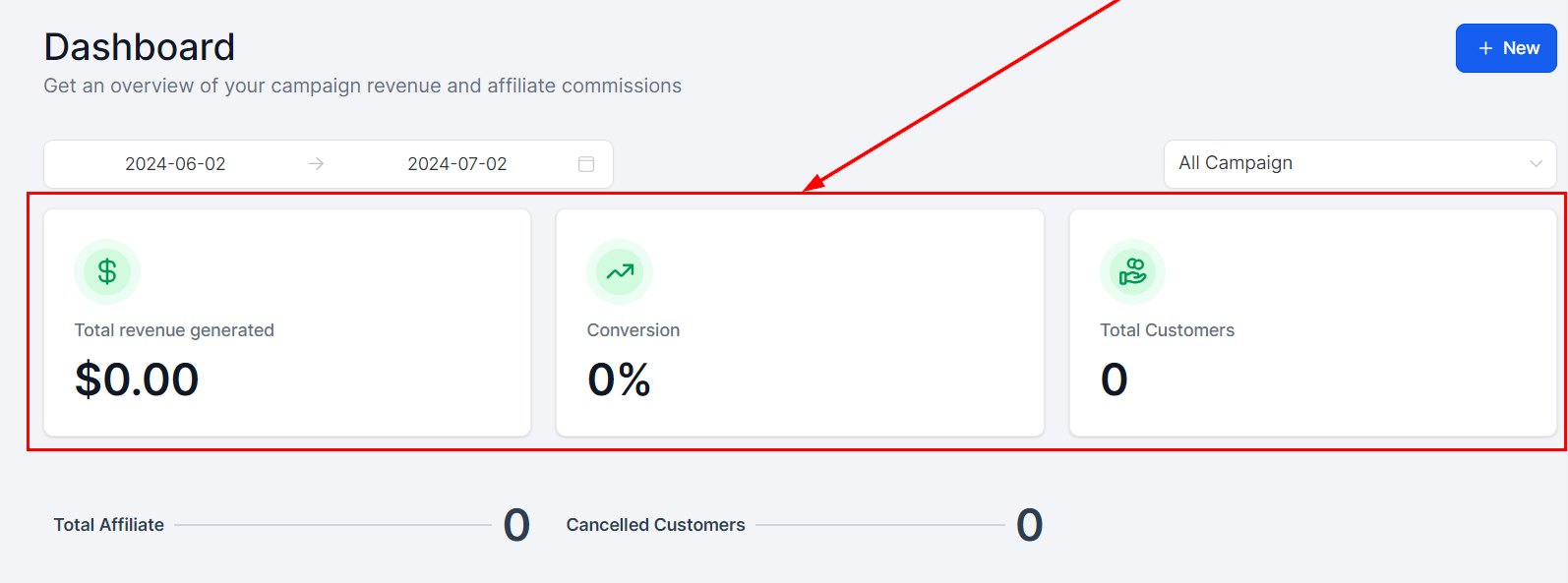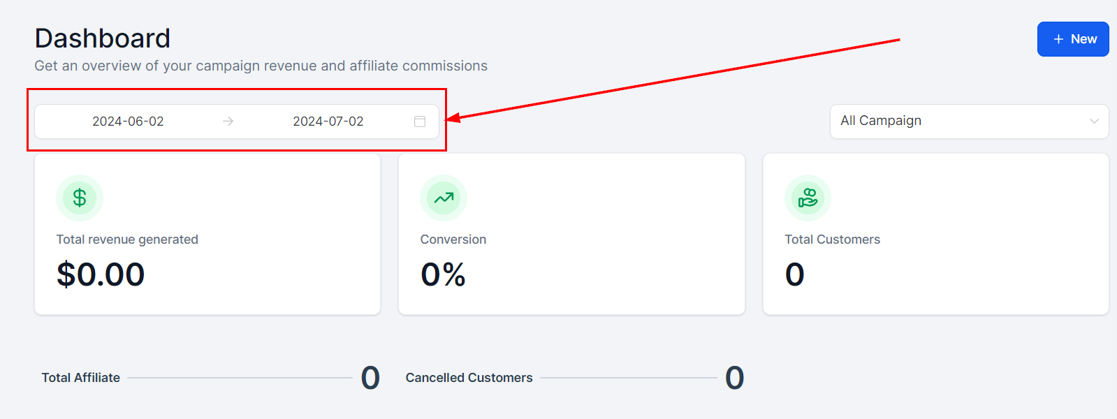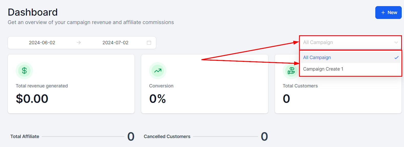 Click the New button to initiate the creation of campaigns or affiliates directly from the dashboard.