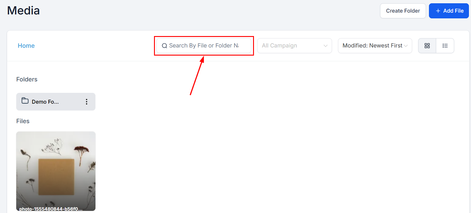 The List View offers detailed insights for each file, including its name, size, associated campaign, and upload date, providing a comprehensive overview of your media assets.