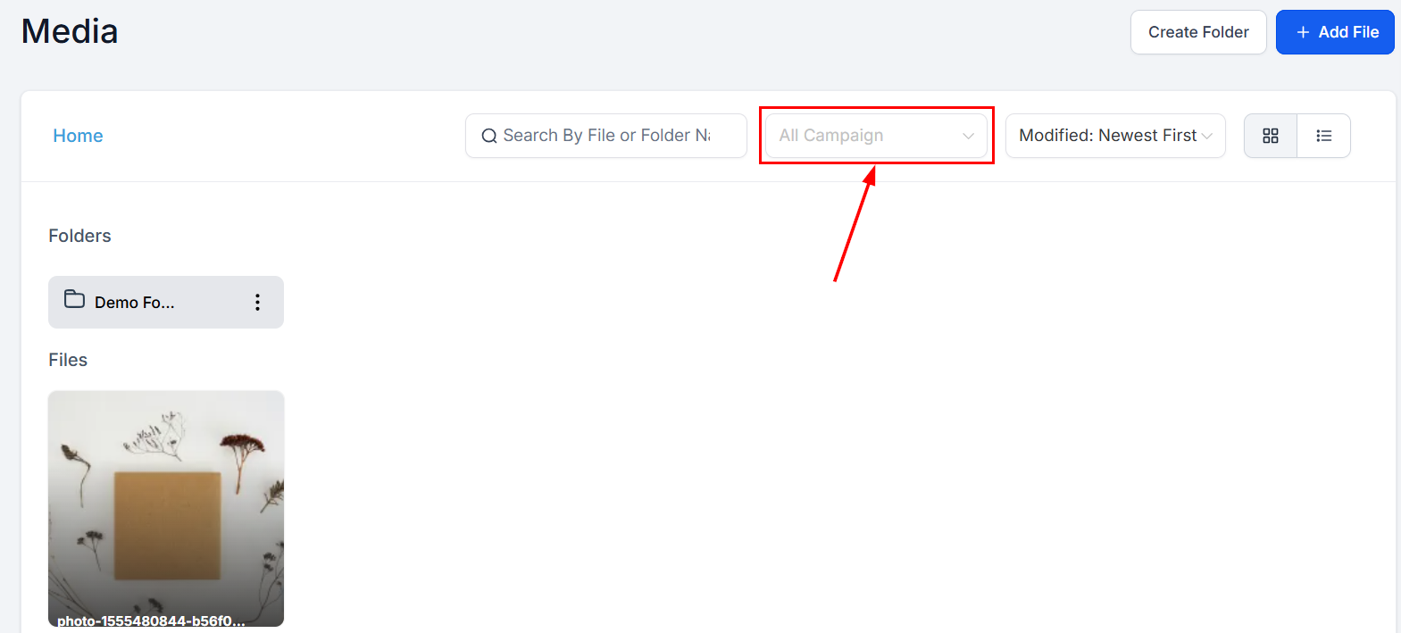 View media associated with a certain campaign by selecting a campaign from the dropdown menu.