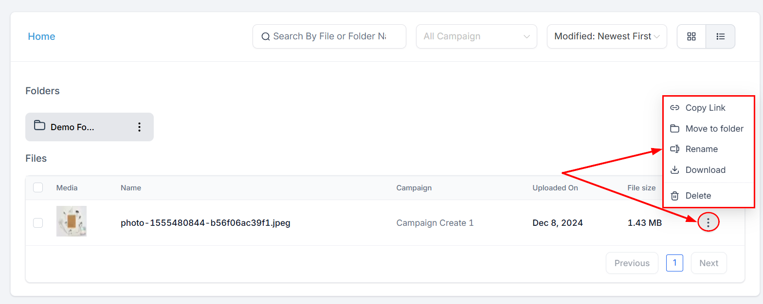 Within the Folders section, you will see all the folders that have been created to efficiently organize your files. Click the actions menu beside each folder to rename or delete it.