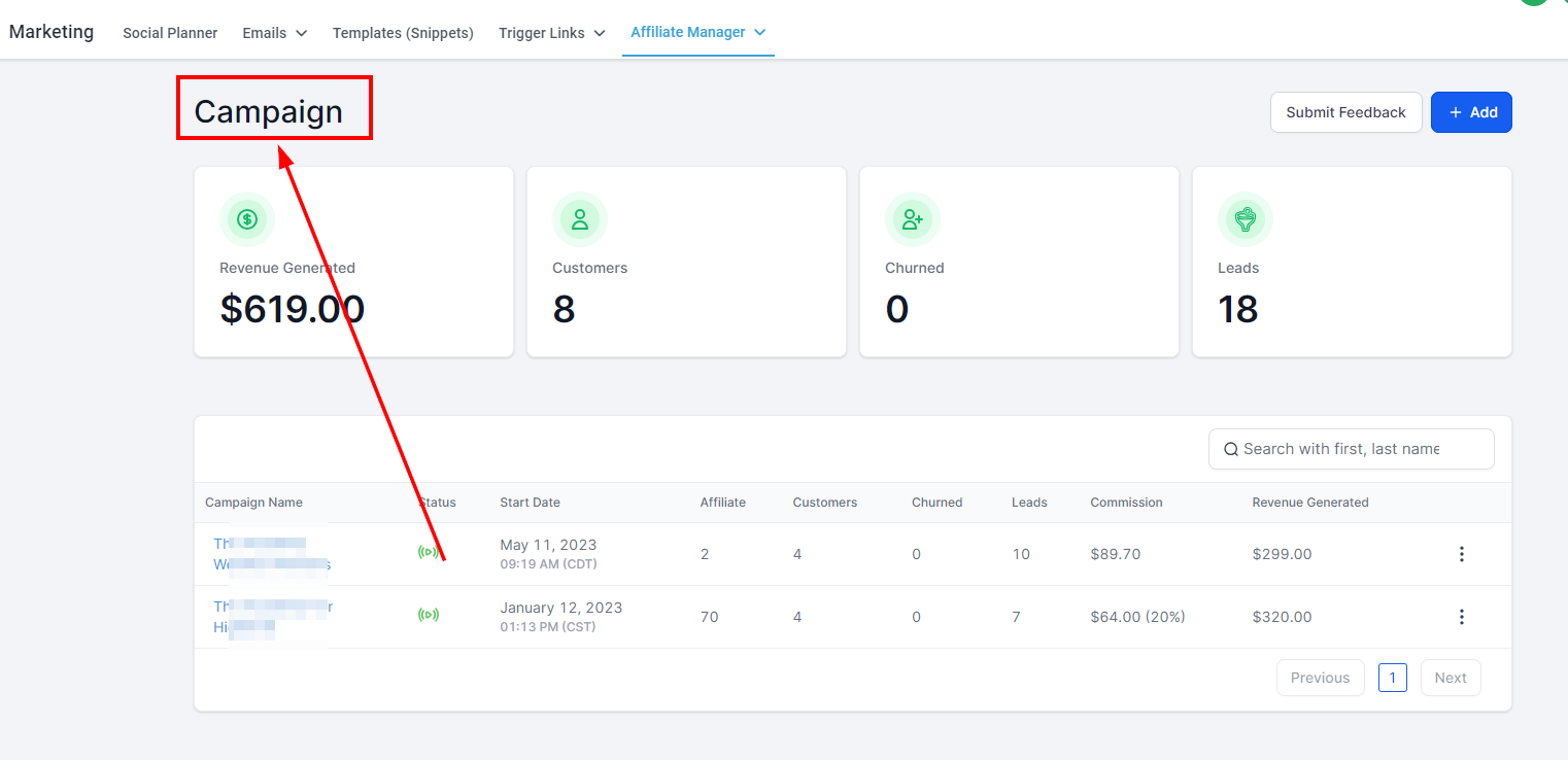 Within the Affiliate Manager, you will see three sections: Campaign, Affiliate, and Payout. An affiliate marketing campaign typically comprises one or more configurations that dictate its progression from inception to completion. These configurations can vary from a straightforward setup, such as a single link, to an intricate multi-step funnel with numerous components.