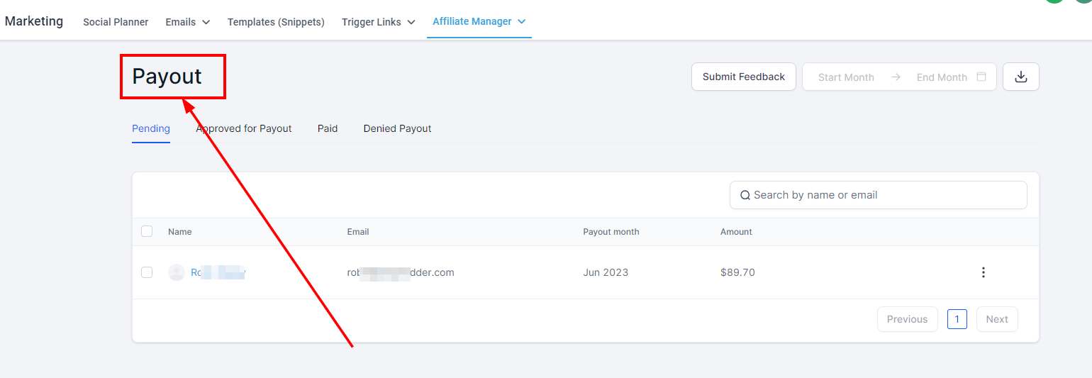 In this section, the affiliate owner can view a comprehensive list of all created payouts and decide whether to approve or reject them for payment. When a customer registers via an affiliate link, the payout and commission are documented and shown on the Payout - Pending tab on the first day of the subsequent month, or as configured earlier.