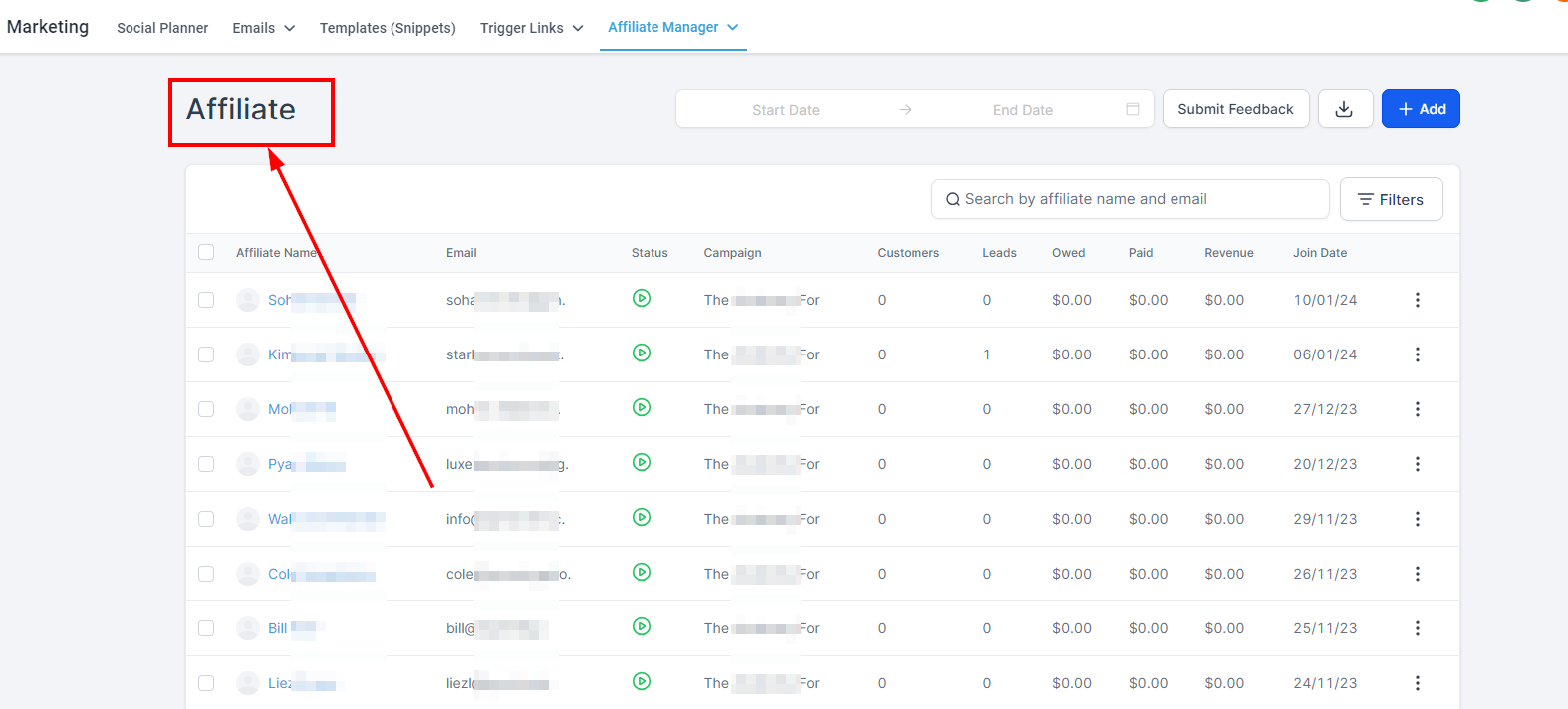 In the Affiliate section, you can create, edit, and manage your affiliates. You can bulk upload multiple affiliates at once, saving you time! View the affiliate dashboard to get insights on how many customers have come from each affiliate, as well as the amount of revenue generated, and the amount of commissions owed to each affiliate.