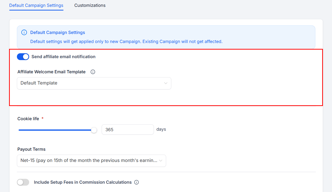 Activate the Affiliate email notification to automatically send an email to new affiliates. Once enabled, choose a template from the dropdown menu or opt for the default template.