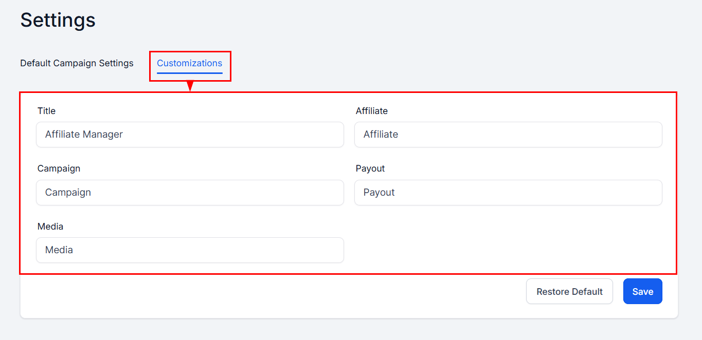 In the Customizations section, you can update the headers of the Affiliate Manager tabs to align with your preferences. These changes will be reflected in the Affiliate Manager dropdown.