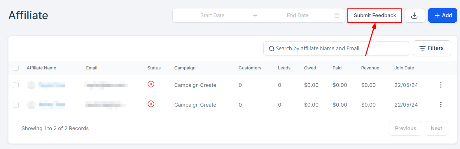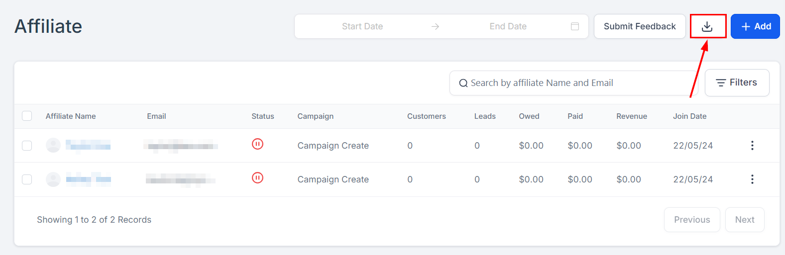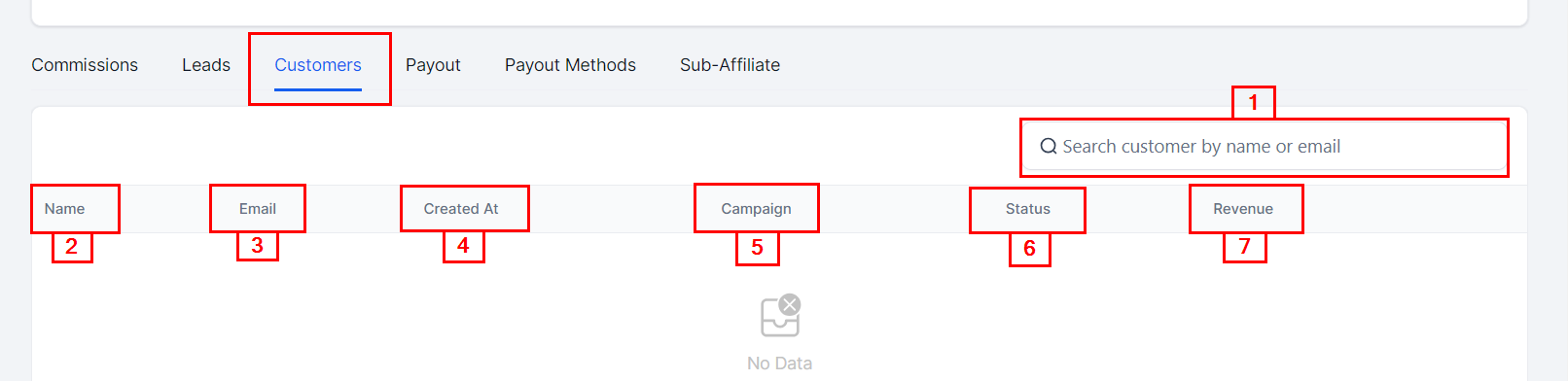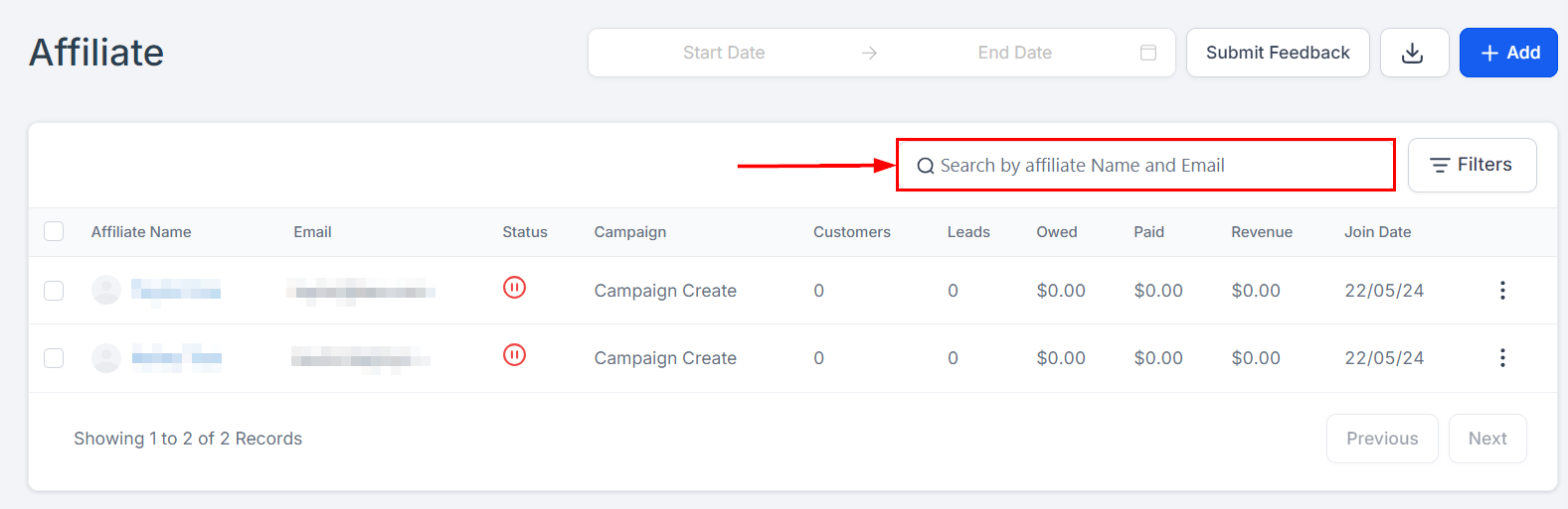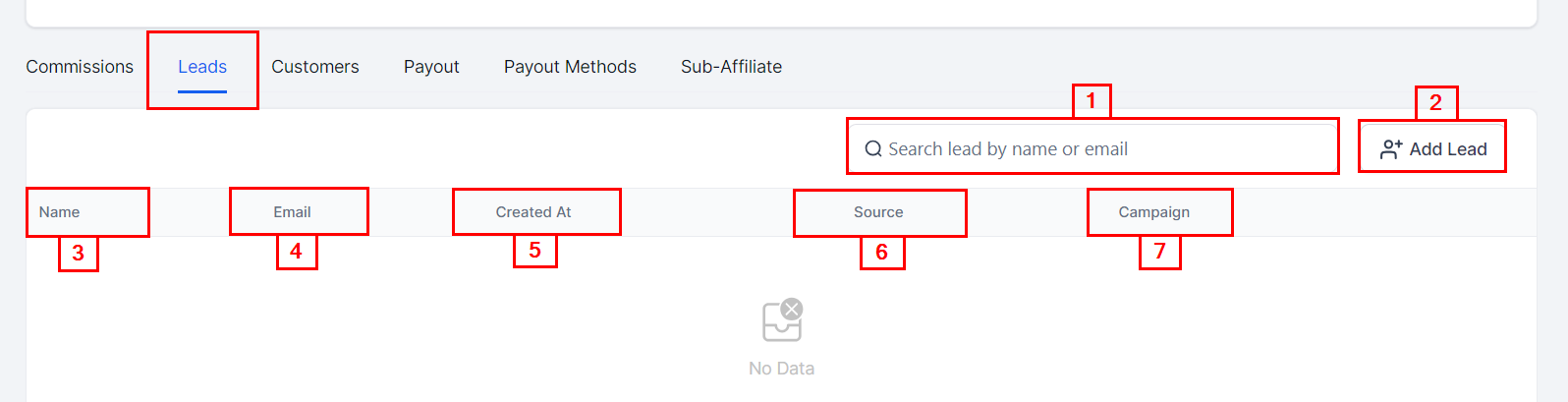 Search Bar: With the search bar, you can easily and quickly search for any lead or sub-affiliate name or email.