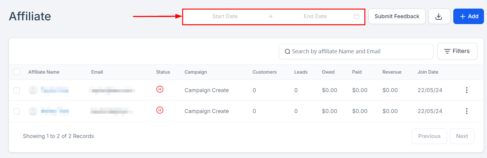 Affiliates can also be filtered by the date they joined using the date filter. Filtering by the date an affiliate joined a campaign is crucial for tracking campaign progress and performance over specific timeframes. This helps in evaluating the effectiveness of recruitment strategies and tailoring targeted communications or incentives based on the affiliate's tenure.