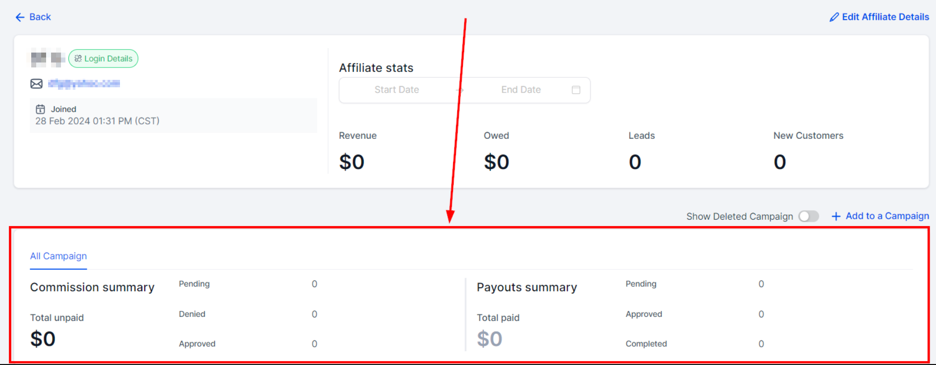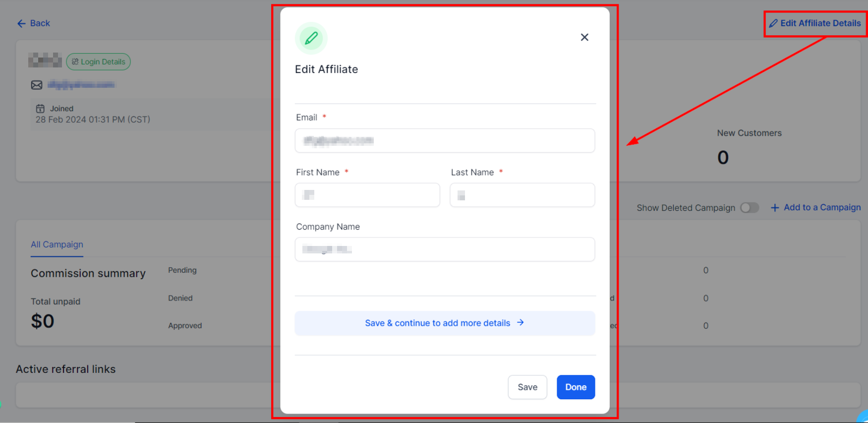 If you want to edit an affiliate profile, click on the "Edit Affiliate details" button.