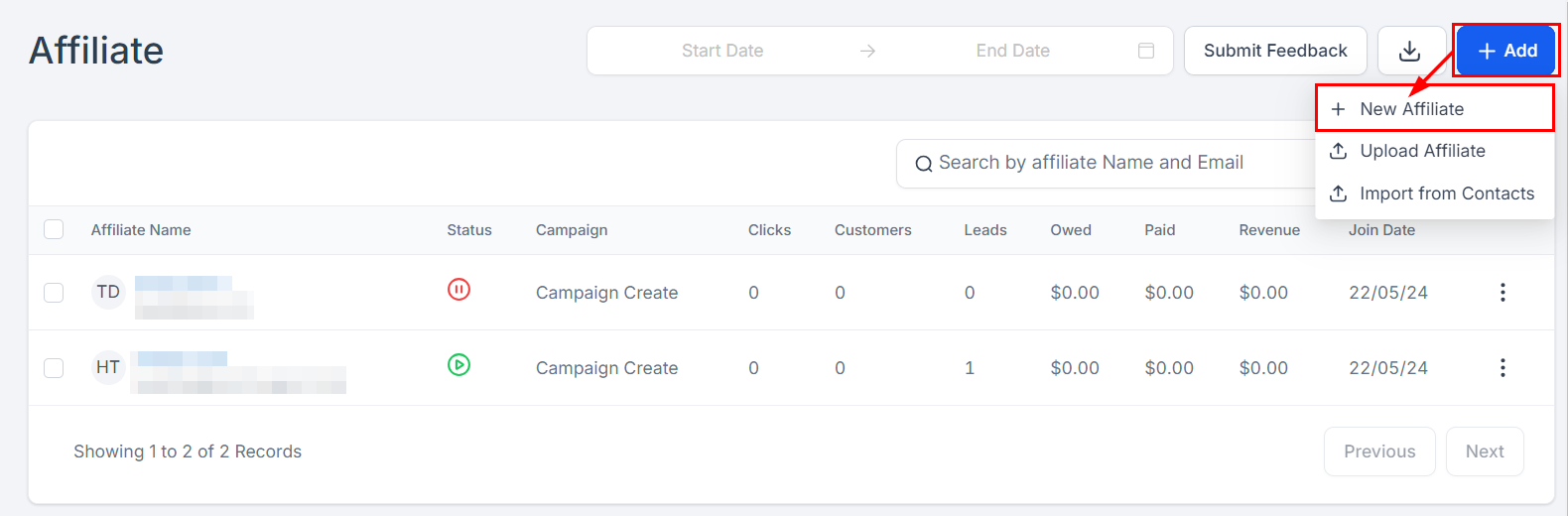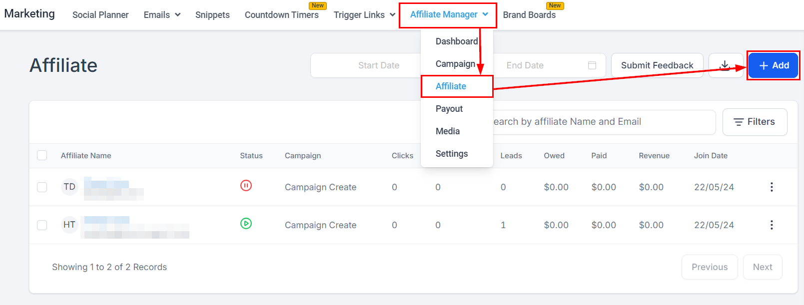 To add a new affiliate, begin by clicking the "Add" button located in the top right corner of the Affiliate page.
