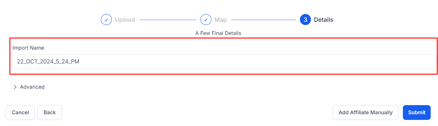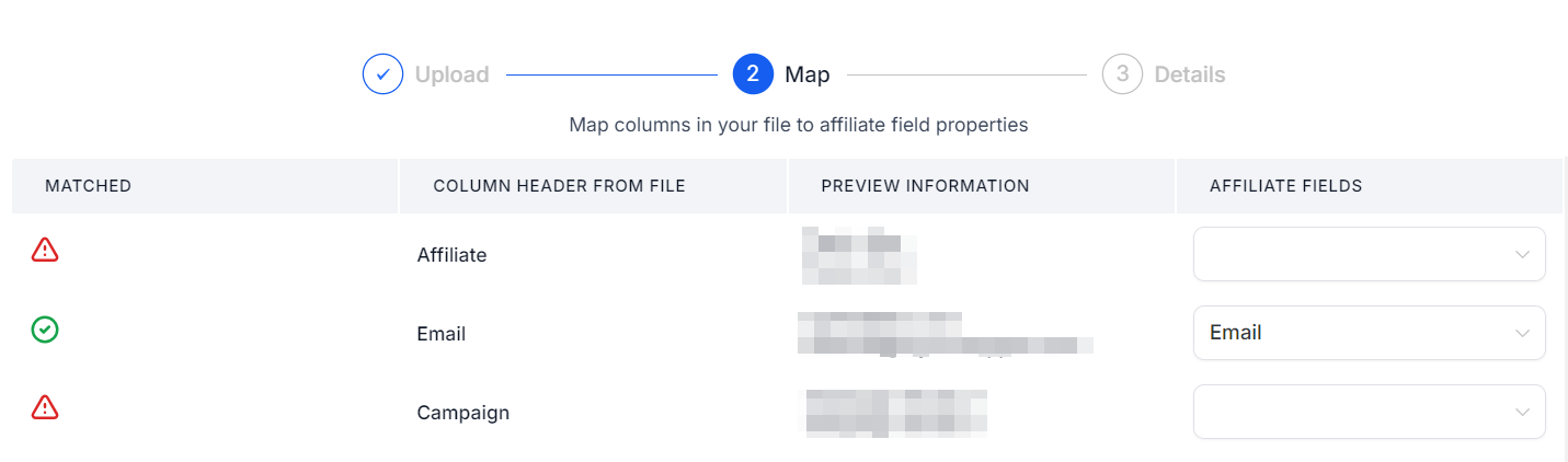 On this page, map the columns in your file to the corresponding columns in the affiliate table. The system will automatically identify matching fields—those that match will be highlighted in green, and those that don’t will be marked in red.