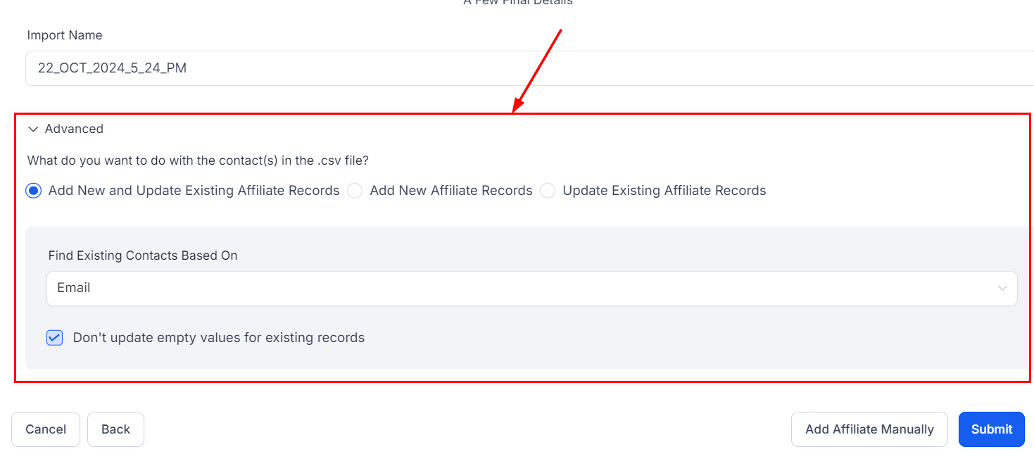 How to handle existing records in the CSV (e.g., update or skip empty values).