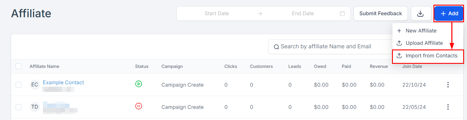 You can also import affiliate information directly from your existing contacts. Click the Add button and select Import from Contacts.