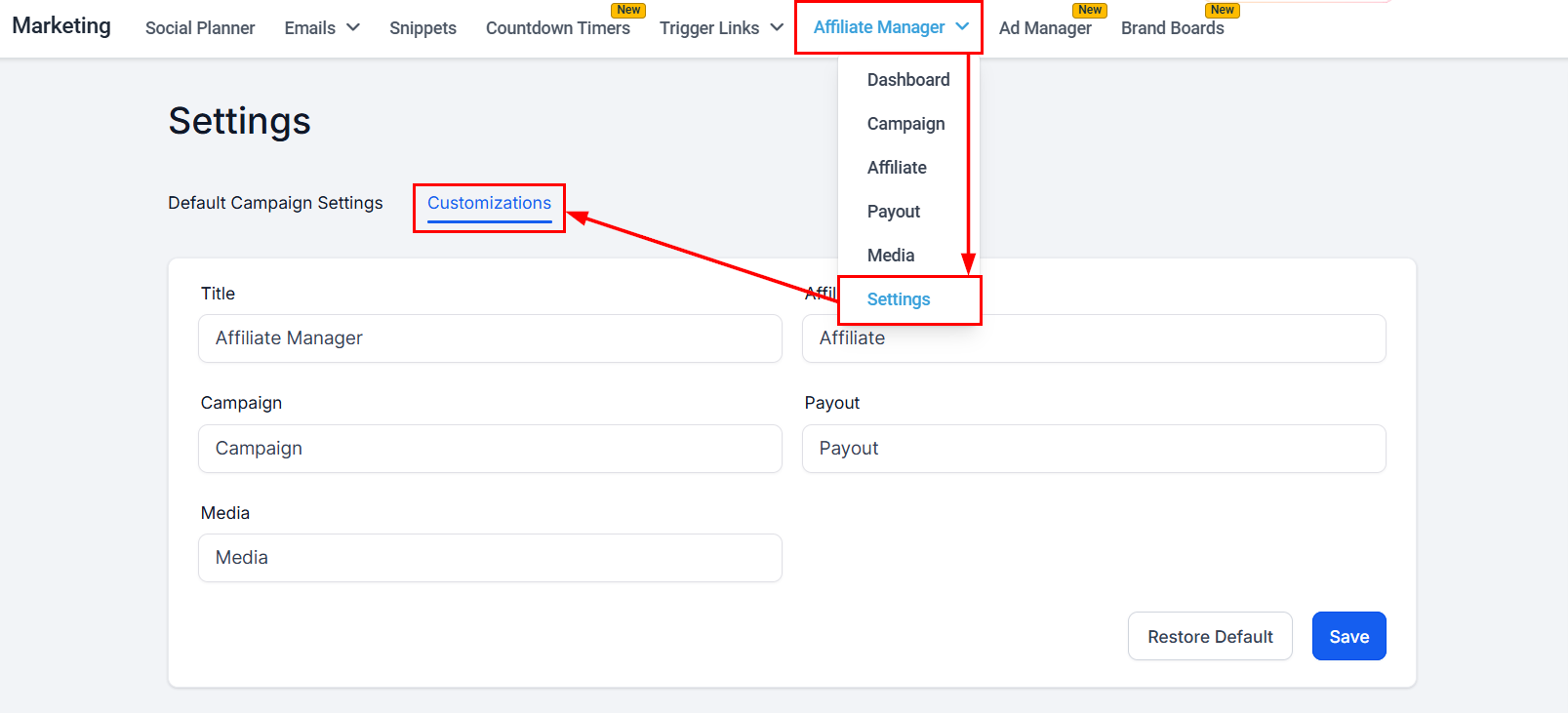 From your account dashboard, head to the Marketing tab and click on the Settings option within the Affiliate Manager dropdown. Within the Affiliate Manager settings, find the "Customizations" menu. This is where you will be able to make your label adjustments.