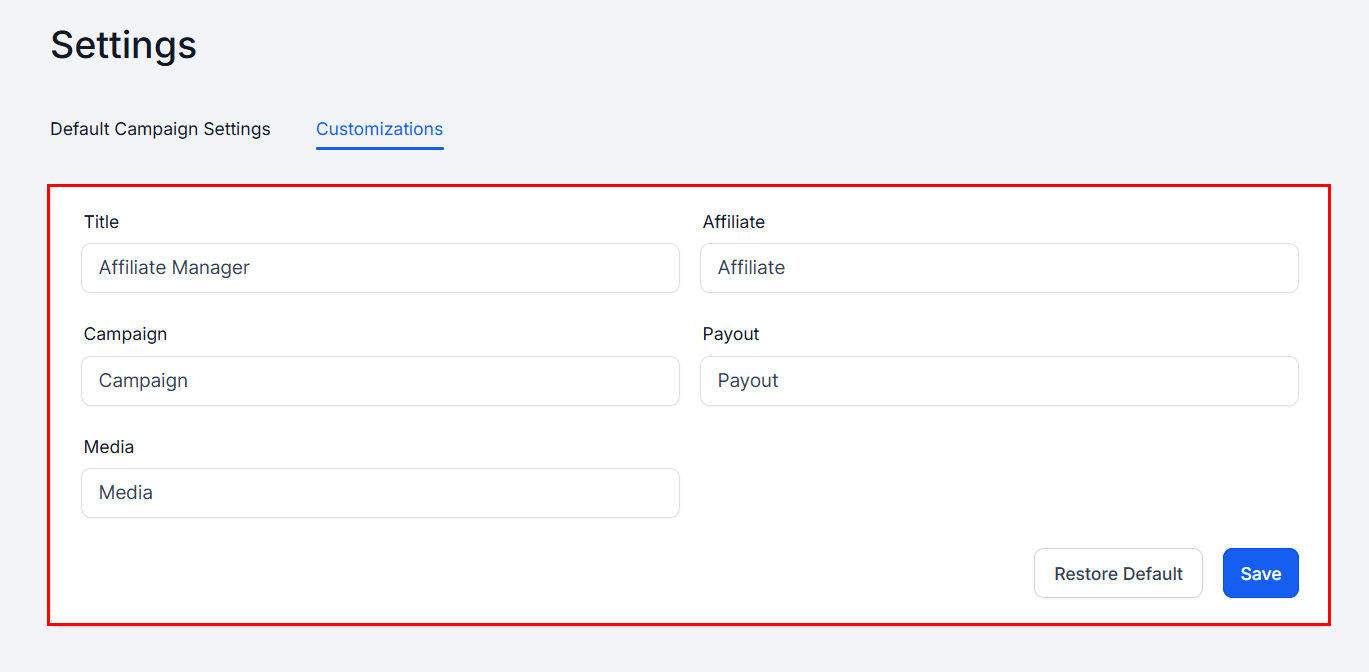 Customizing labels in your Affiliate Manager enables you to align the platform with your unique brand identity and industry terminology. This personalization enhances the clarity and usability of your platform so you can create an intuitive, user-friendly experience that reflects your organization's goals.