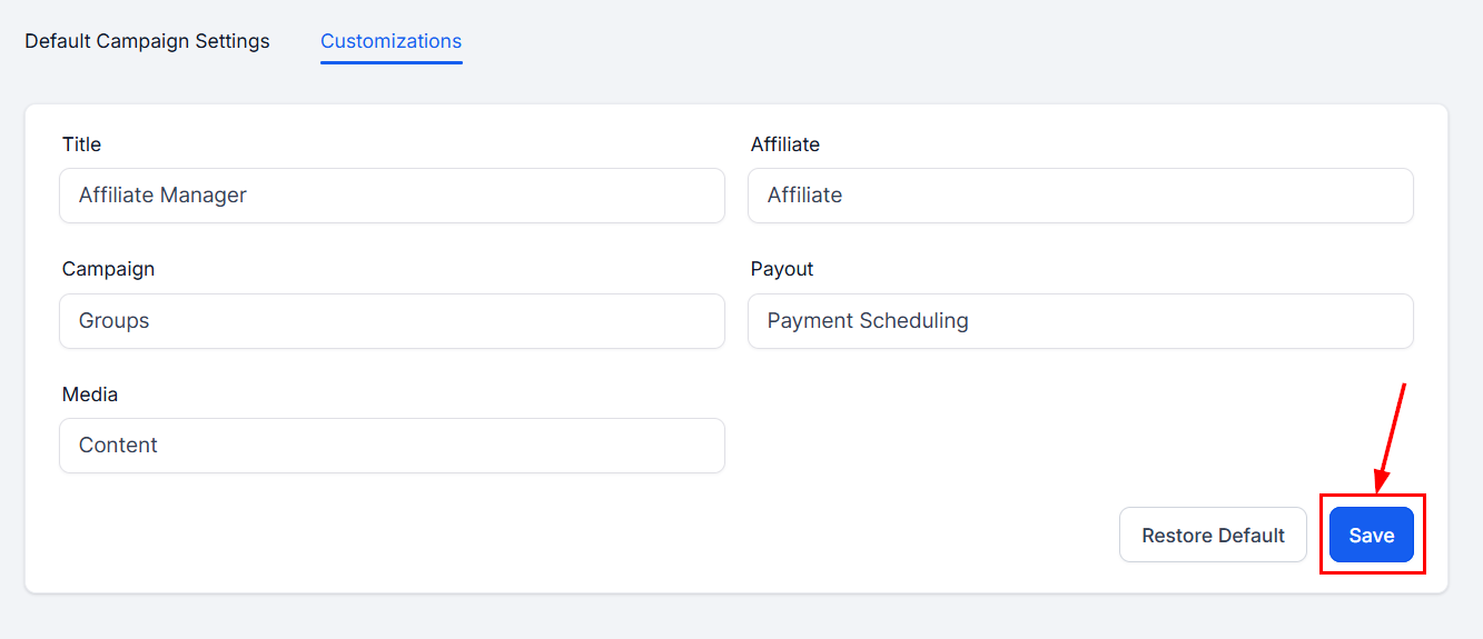 After making your desired customizations, ensure you save your changes to apply them to your Affiliate Manager.